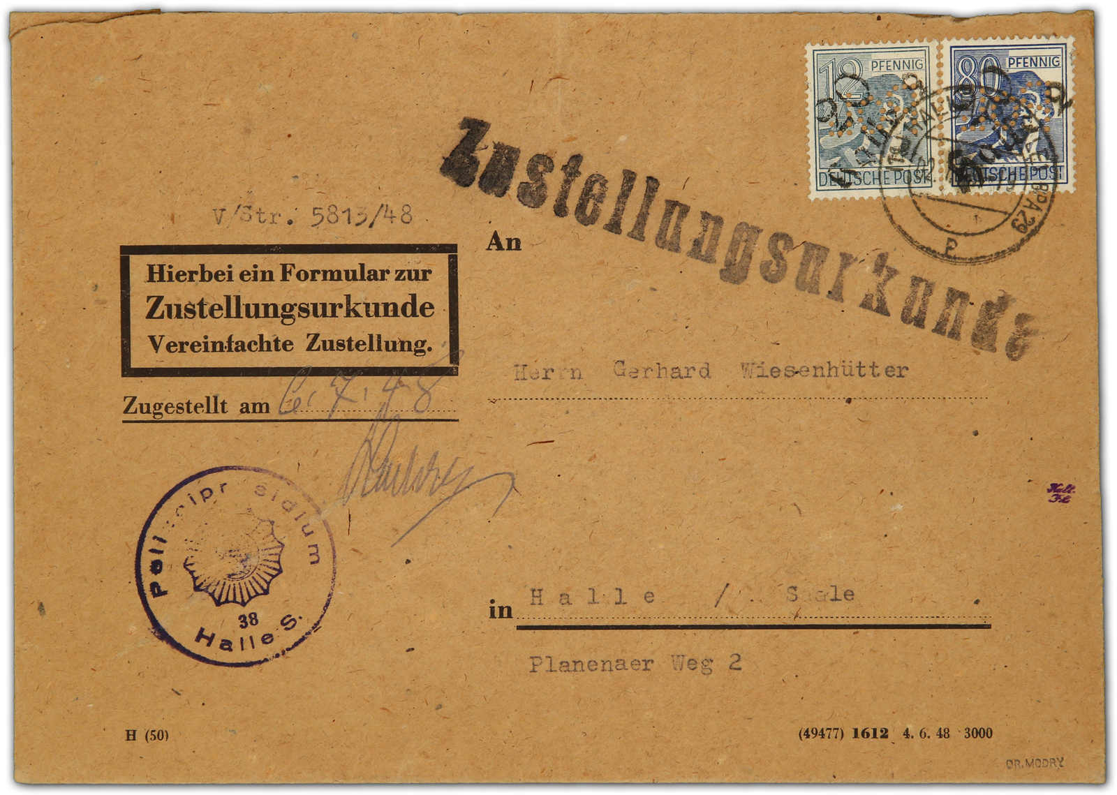 1948, 12 und 80 Pfg. Arbeiter mit Handstempelaufdruck "20 Halle 2" mit spiegelverkehrter POL-Lochung auf portogerechter Zustellungsurkunde der 2. Gewichtsstufe, einwandfrei, die POL-Lochungen auf Brief sind eine große Rarität! signiert