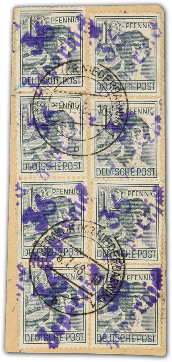 1948, 12 Pfg. Freimarke mit violettem Bezirksstempelaufdruck "36 Zepernick" 8mal auf Paketkartenausschnitt, Stempel "ZEPERNICK (KR. NIEDERBARNIM) 8.8.48", 2 Werte Bedarfszähnung, sonst einwandfrei, die violette Aufdruckfarbe dieses Ortes
