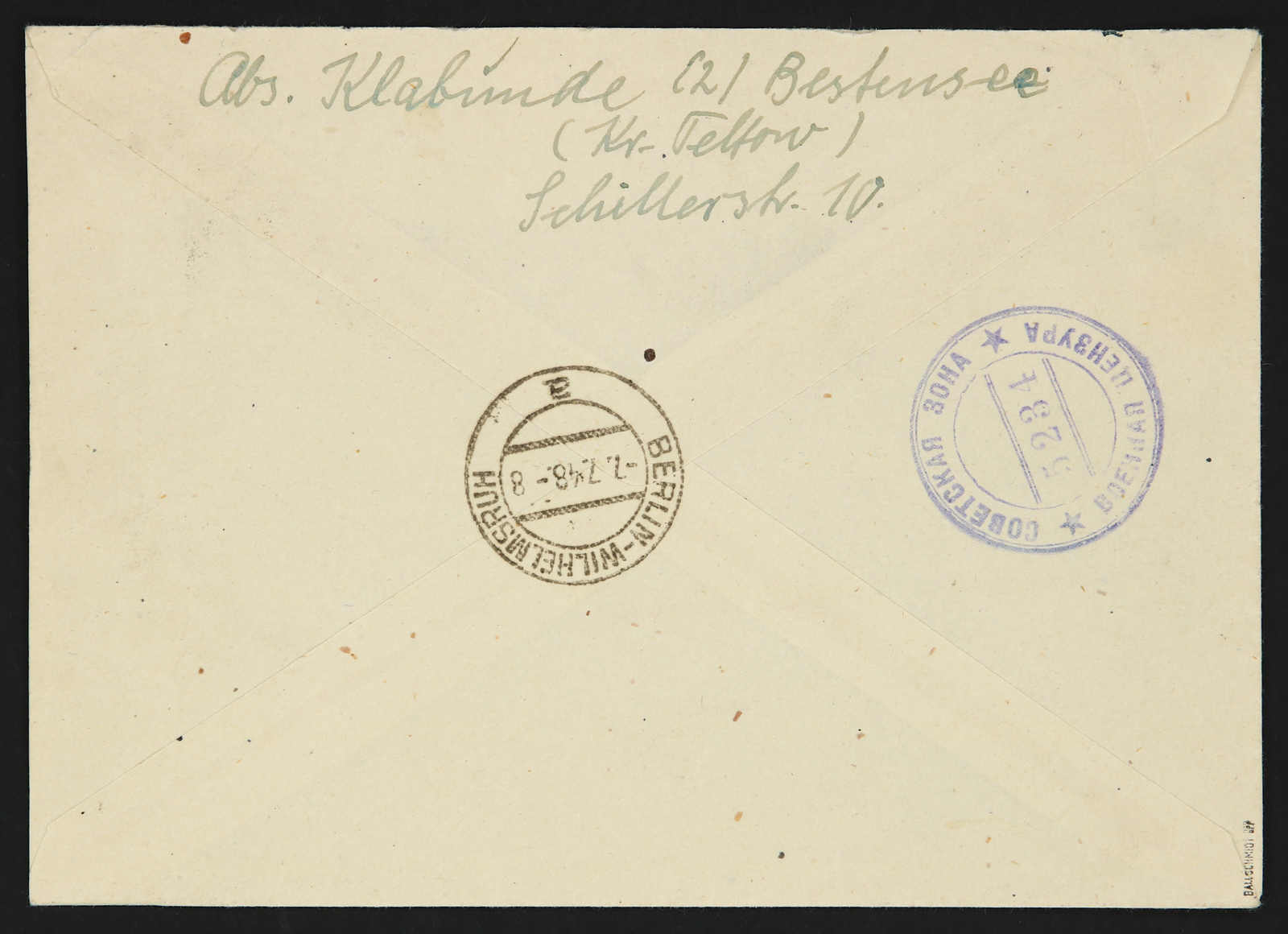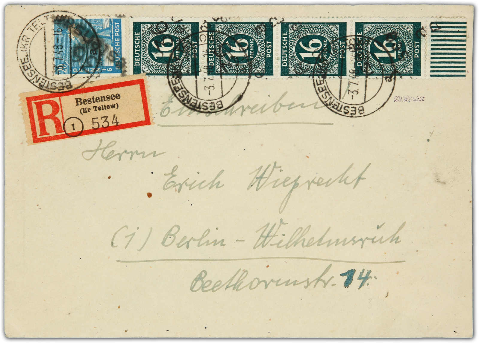 1948, 20 Pfg. Sämann und 16 Pfg. Ziffer im senkrechten Unterrandviererstreifen mit Bezirksstempelaufdruck "36 Bestensee a" auf tarifgerecht frankiertem Einschreibbrief, Stempel "BESTENSEE (KR. TELTOW) 3.7.48", rückseitig Ankunfts- und