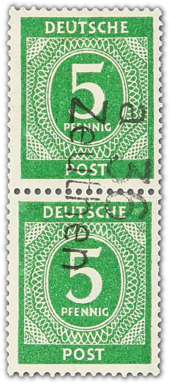 1948, 5 Pfg. Ziffer im senkrechten Paar mit senkrecht über beide Marken abgeschlagenem Bezirksstempelaufdruck "36 Zeuthen a", obere Marke ungebraucht, untere Marke postfrisch, einwandfrei mit der für diese Ausgabe üblichen Zähnung, sign.