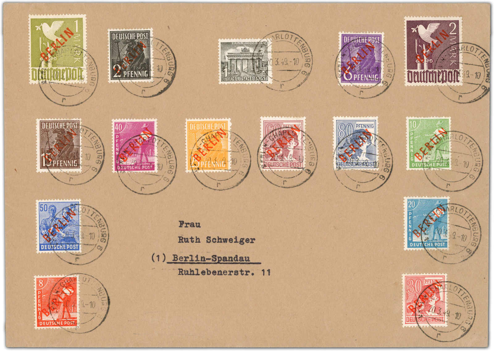 1949, 2 Pfg. bis 2 M. Rotaufdruck und 1 Pfg. Brandenburger Tor zusammen auf phantastischem Vor-Ersttagsbrief, vom Postamt im Hause der Magistratsverwaltung für Post- und Fernmeldewesen wurden die Werte schon am 20.3.49 ausgegeben und