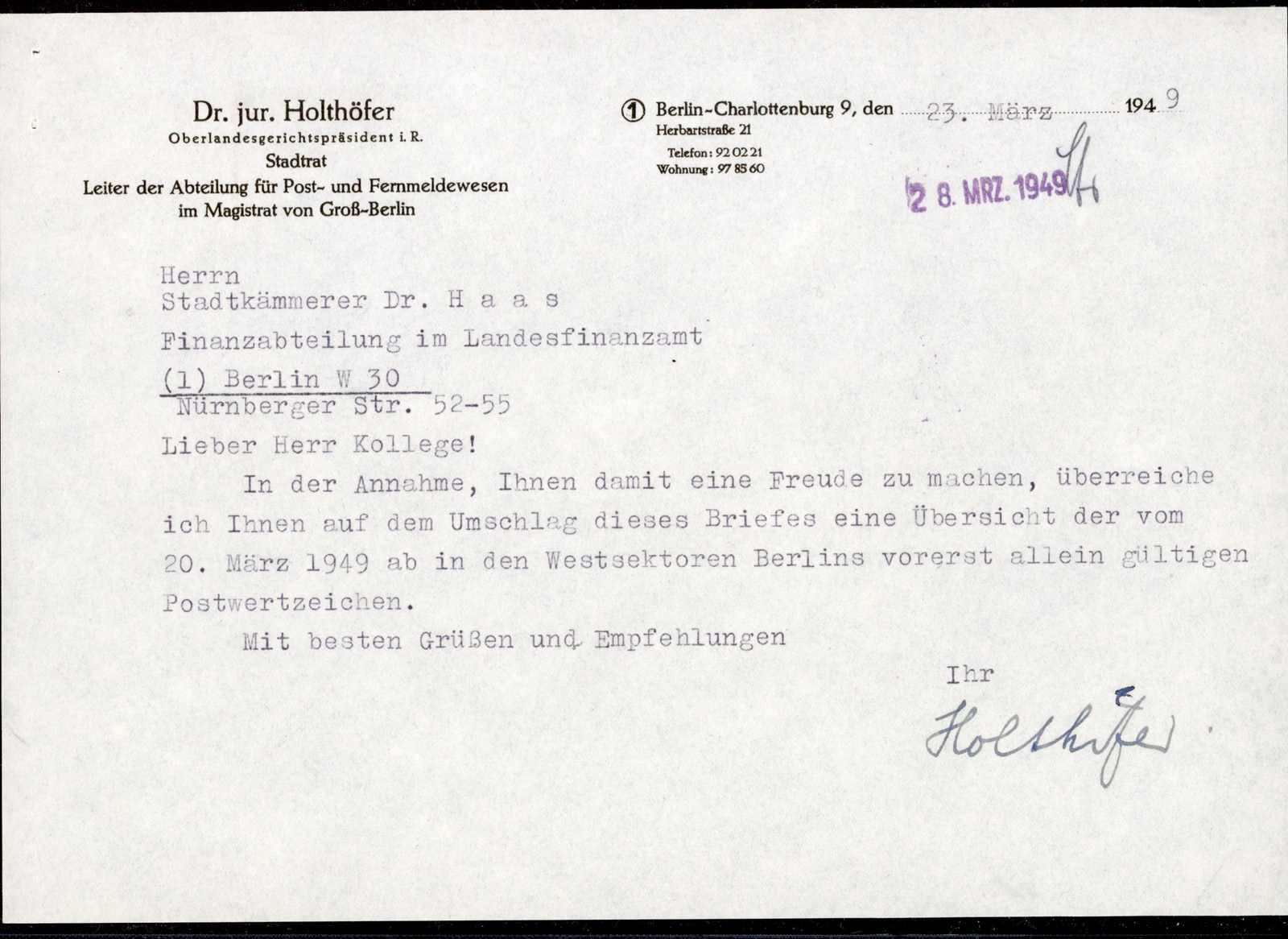 entwertet, nur drei Briefe dieser Art sind bekannt! Beiliegend Kopie-Schreiben von Dr. Holthöfer, dass die Rotaufdruckmarken auf dem Umschlag bereits ab dem 20. März 1949 in West-Berlin gültig sind, mehr geht nicht, eine der ganz großen