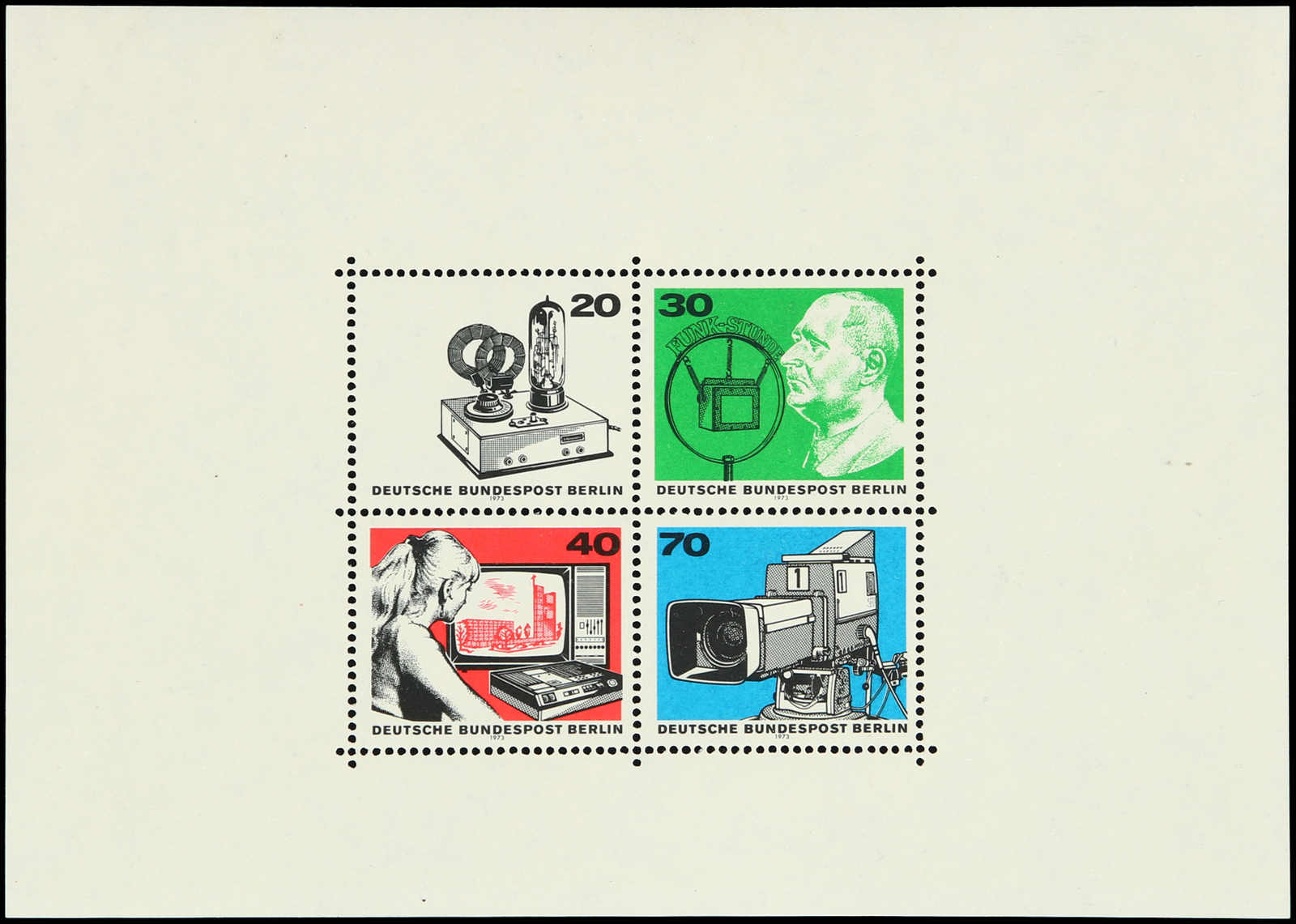 1973, Blockausgabe 50 Jahre Rundfunk, Farben Grau (Blockrand) und Braungelb (Untergrund bei Mi-Nr. 455) fehlend, postfrischer Block, 4 spitze Ecken, für diesen schwierigen Block völlig ohne Büge oder Knicke, einwandfreie Qualität,