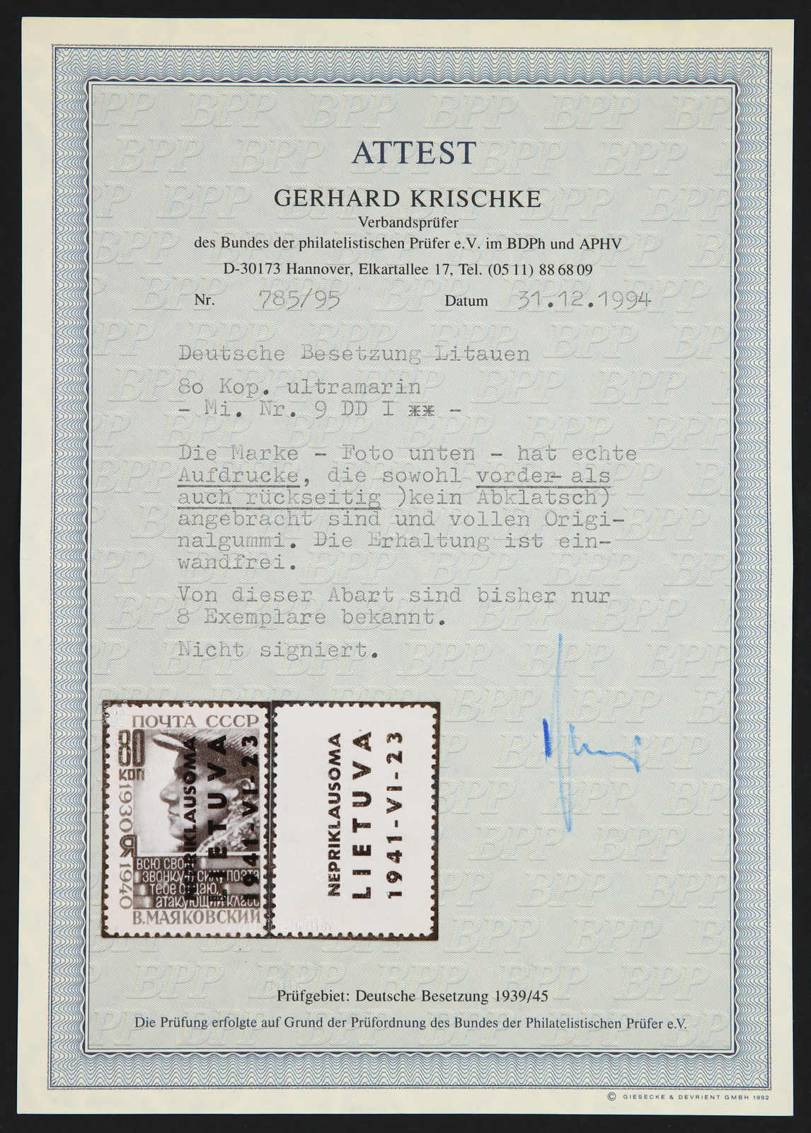 1941, 80 Kop. Freimarke, postfrische Marke mit Aufdruck vorder- und rückseitig, einwandfreie Qualität, es sind nur 8 Exemplare bisher bekannt, unsigniert, Fotoattest Krischke BPP (ME 3.500,-) (Image) (imagea)