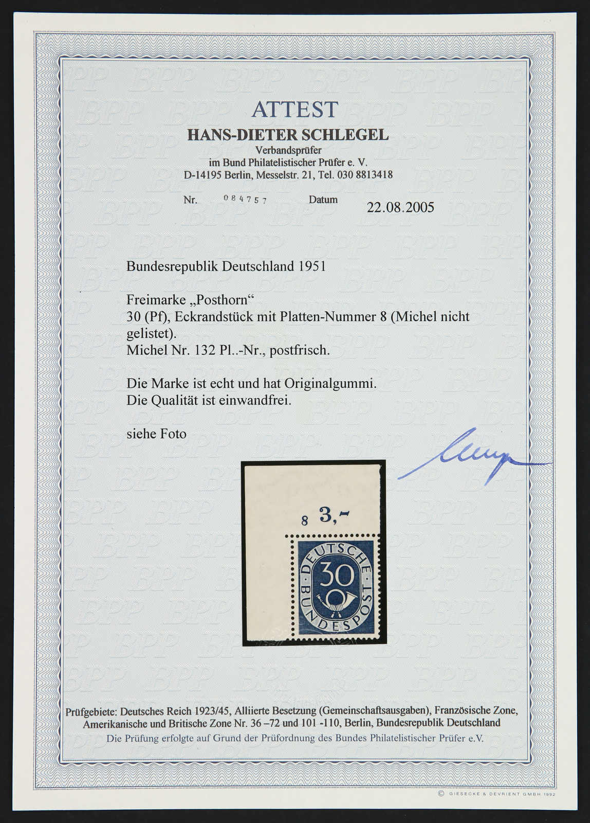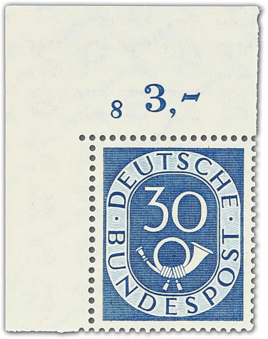 1951, 30 Pfg. Posthorn postfrisch, perfekte Bogenecke oben links mit sehr seltener Formnummer "8", ungefaltet und unsigniert in einwandfreier Qualität, Fotoattest Schlegel BPP (Image) (imagea)