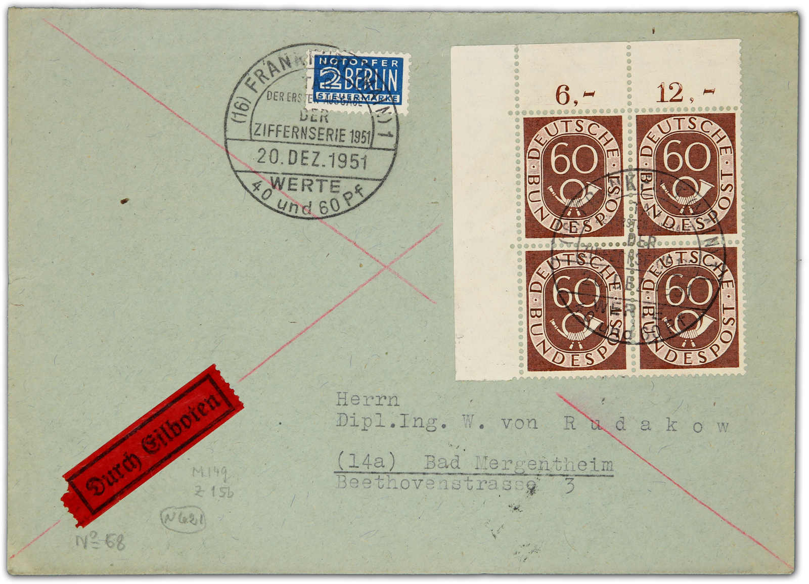 1951, 60 Pfg. Posthorn äußerst dekorativ im Eckrandviererblock auf überfrankiertem echt beförderten Eilbotenbrief mit Ersttagssonderstempel 20.12.1951 (FDC), einwandfreie Qualität, Fotoattest Schlegel BPP (Image) (imagea)