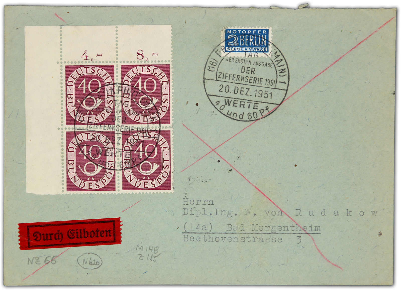 1951, 40 Pfg. Posthorn äußerst dekorativ im Eckrandviererblock auf überfrankiertem echt beförderten Eilbotenbrief mit Ersttagssonderstempel 20.12.1951 (FDC), einwandfreie Qualität, Fotoattest Schlegel BPP (Image) (imagea)