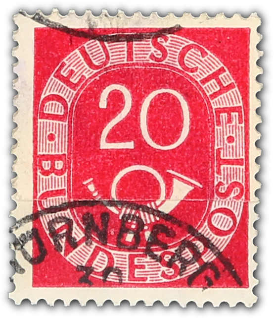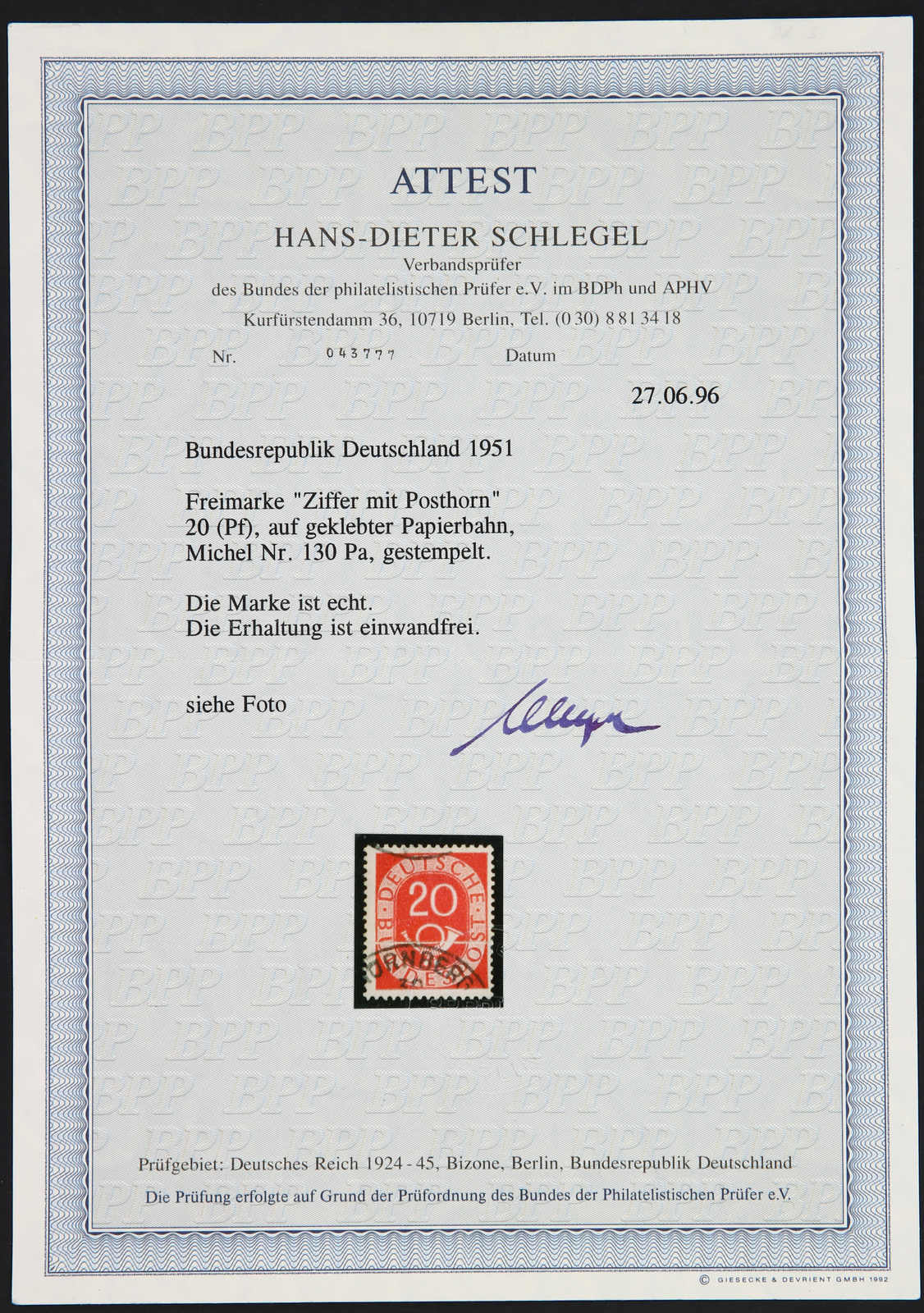 1951, 20 Pfg. Posthorn, gestempelt auf geklebter Papierbahn, beide Markenteile vorhanden, durch Wässern gelöst und mit Falz gestützt, eindrucksvolle Einheit, vermutlich handelt es sich hierbei um ein Unikat, Fotoattest Schlegel BPP (Image) (imagea)