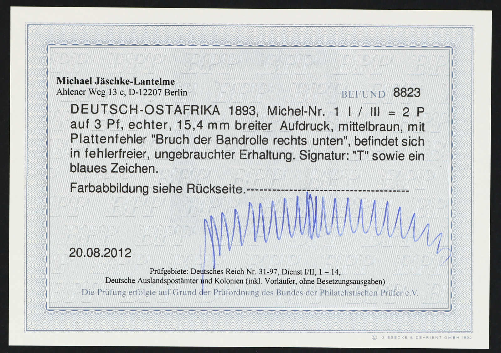 Get Market Data for [German East Africa Michel: 1 I PF II] Visual Pricing Guide Sample Census