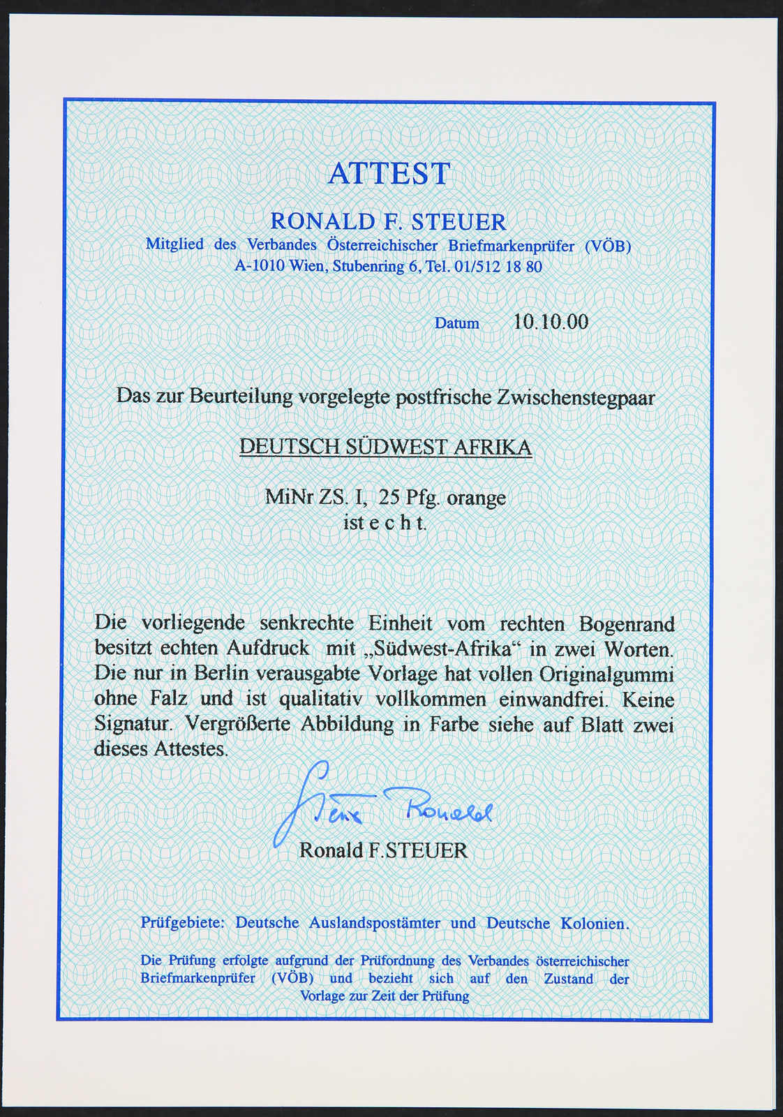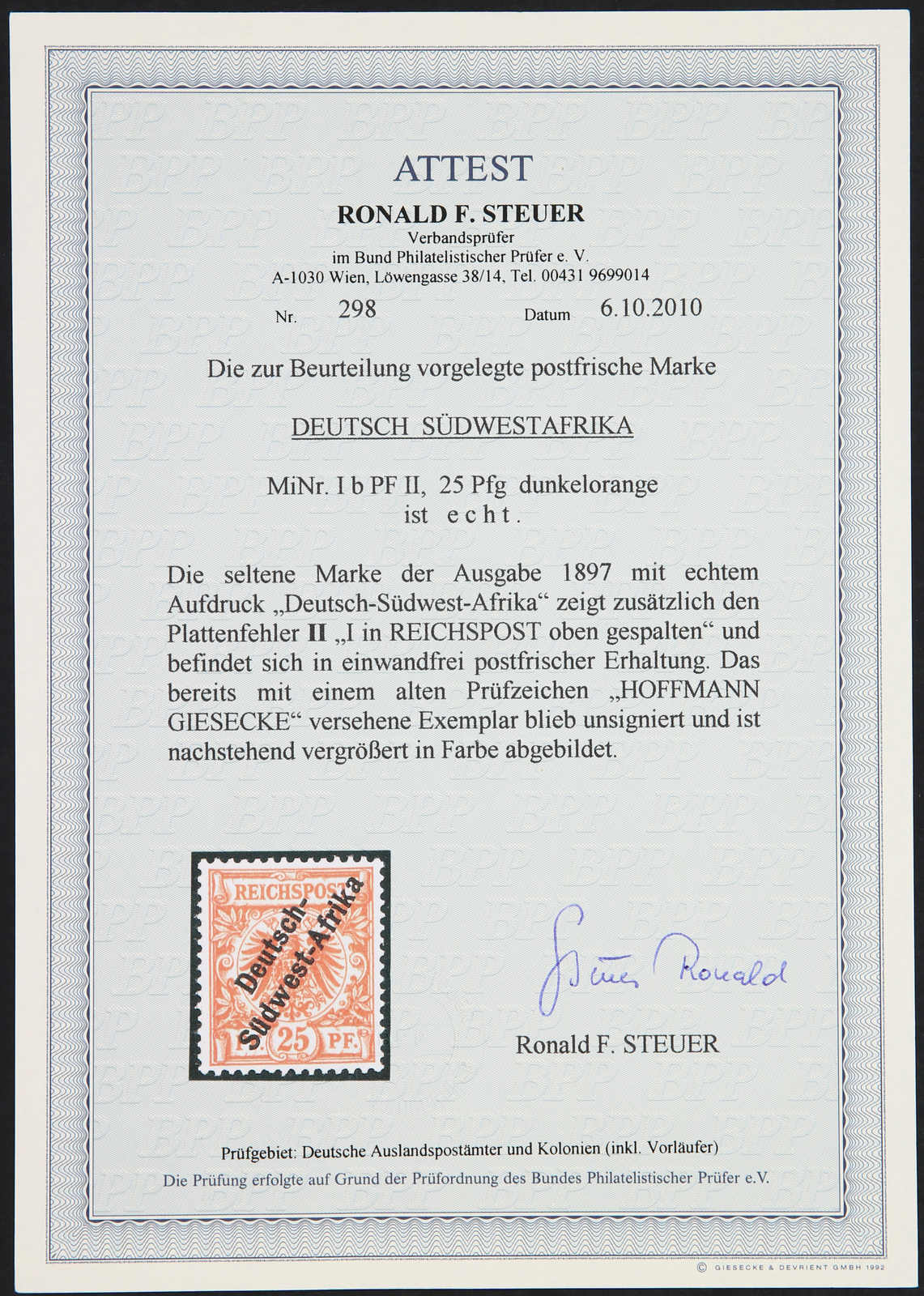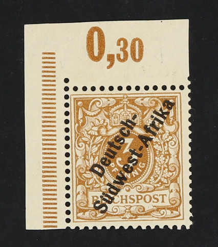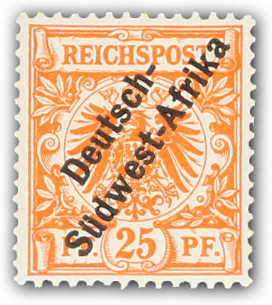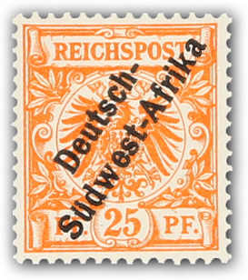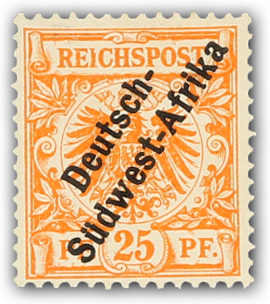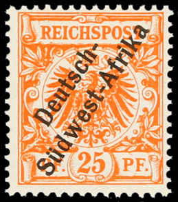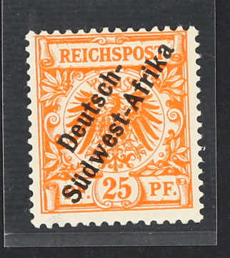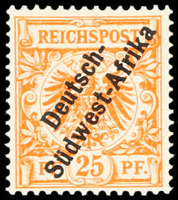 1897, 25 Pfg. Krone/Adler gelborange mit schrägem Aufdruck "Deutsch-Südwest-Afrika", postfrischer Einzelwert, farbfrisch und gut gezähnt, einwandfrei, sign. R.F.Steuer VÖB (ME 750,-) (Image)