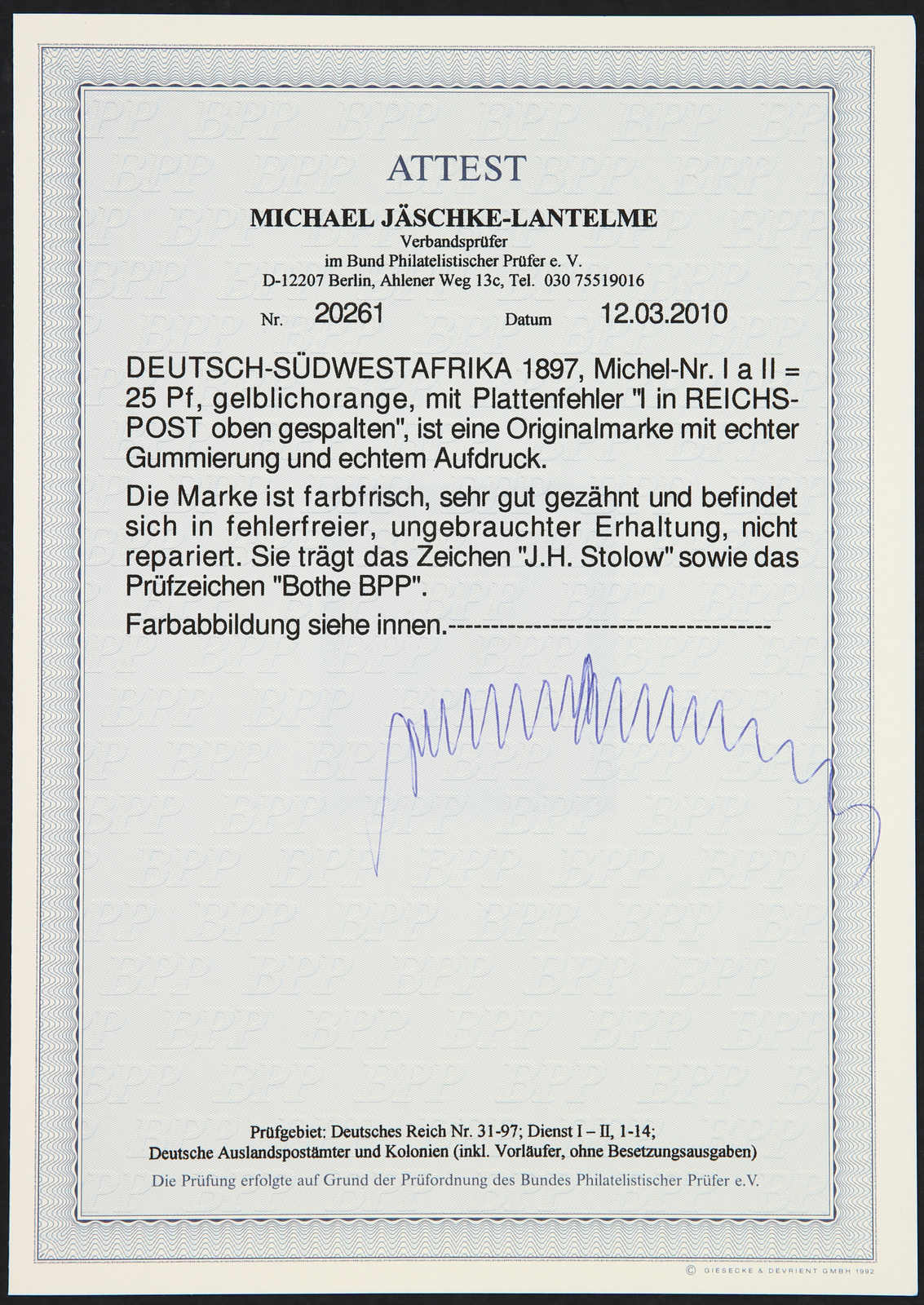 1897, 25 Pfg. Aufdruckausgabe gelblichorange, mit Plattenfehler "I in REICHSPOST oben rechts ausgebrochen", ungebraucht, einwandfrei, Fotoattest Jäschke-Lantelme BPP (ME 1.500,-) (Image) (imagea)