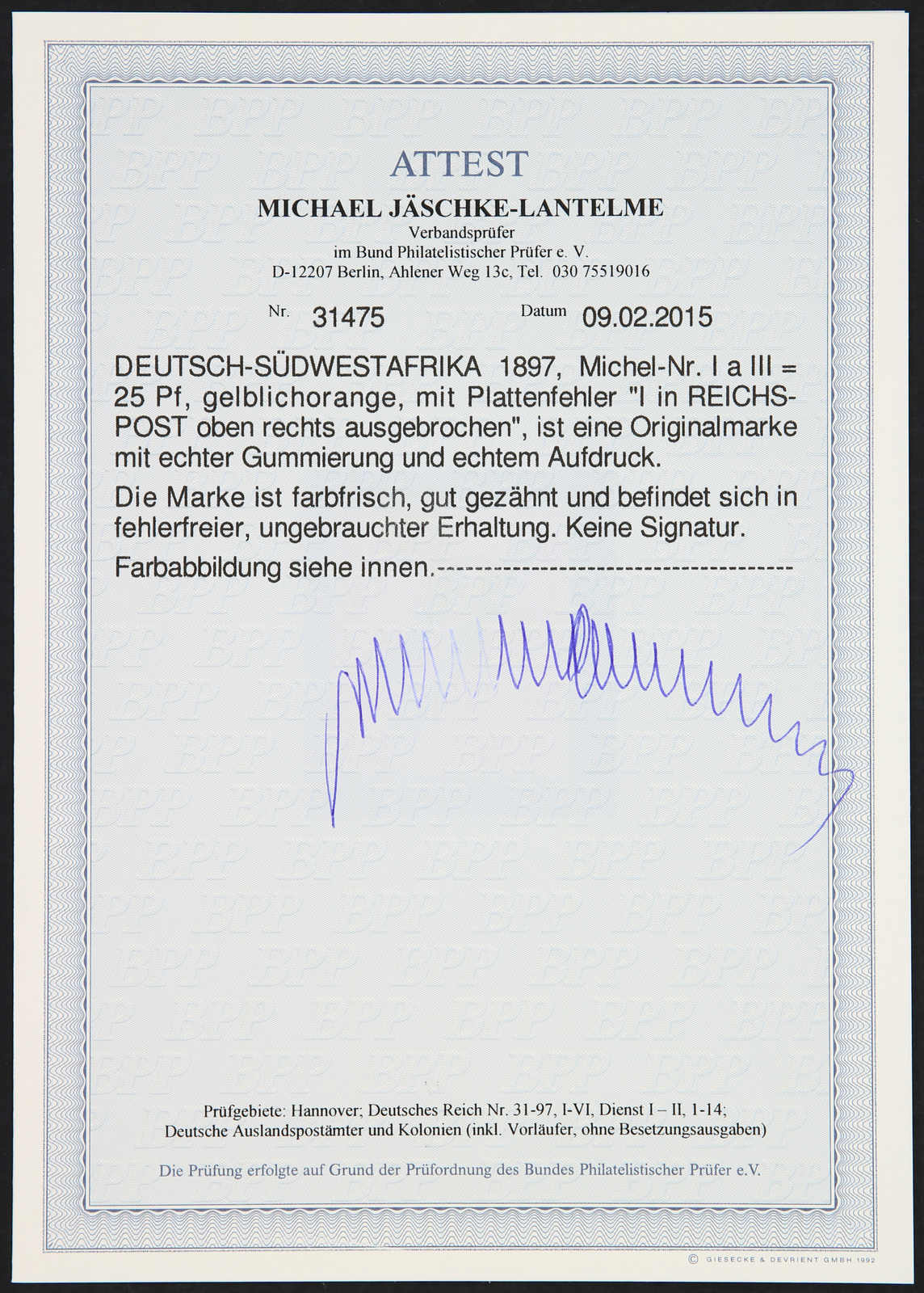 1897, 25 Pfg. Aufdruckausgabe gelblichorange, mit Plattenfehler "I in REICHSPOST oben gespalten", ungebraucht, einwandfrei, signiert, Fotoattest Jäschke-Lantelme BPP (ME 800,-) (Image) (imagea)