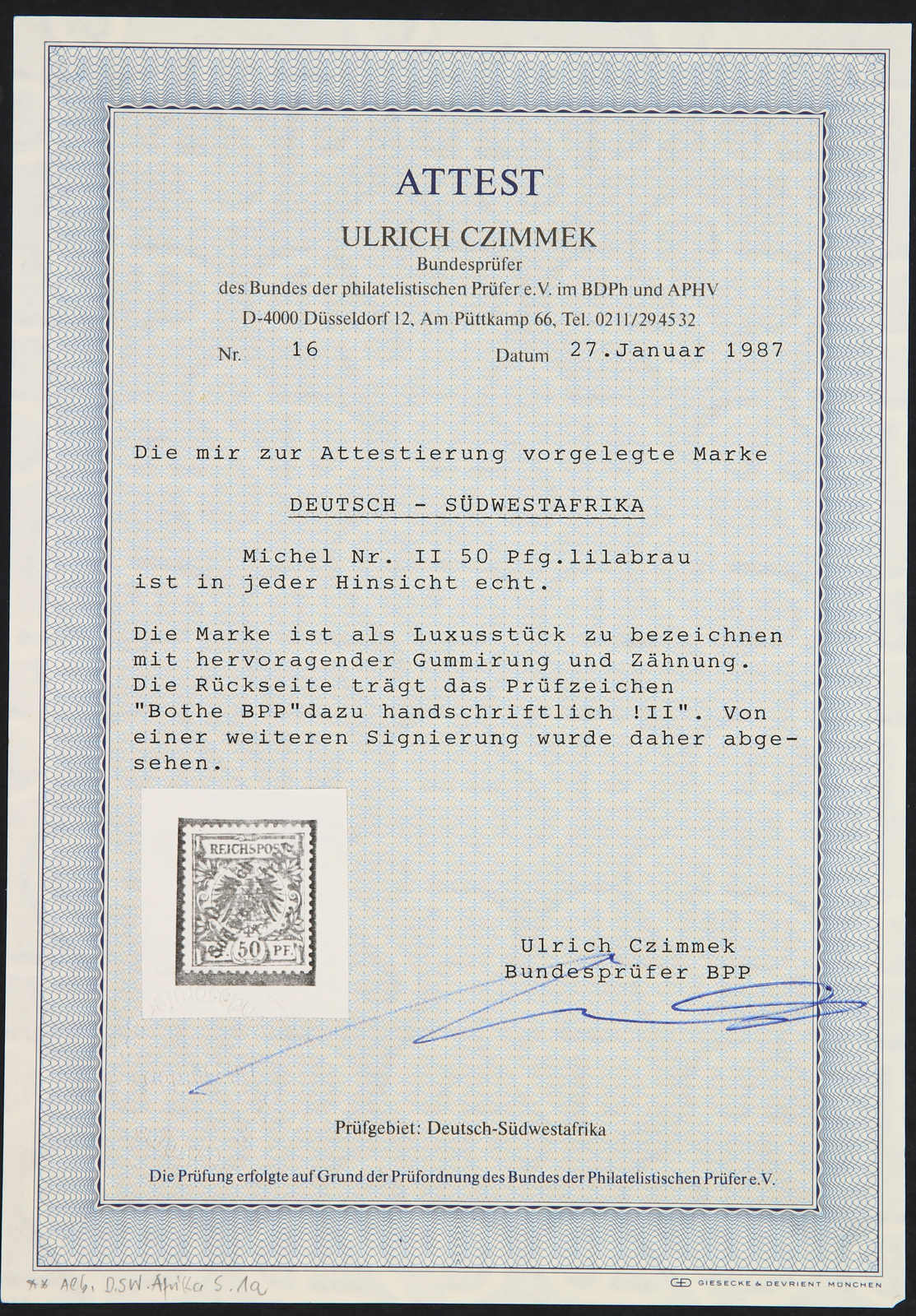 1897, 50 Pfg. Aufdruckausgabe lebhaftrötlichbraun, postfrisch, einwandfrei, signiert Bothe BPP, Fotoaattest Czimmek BPP (ME 750,-) (Image) (imagea)