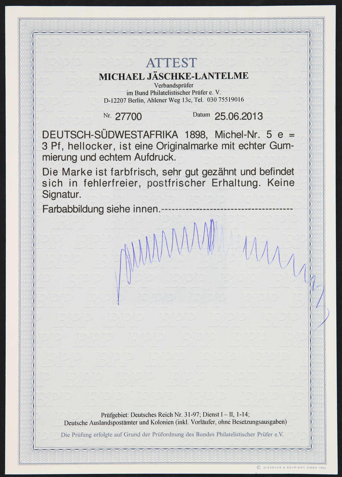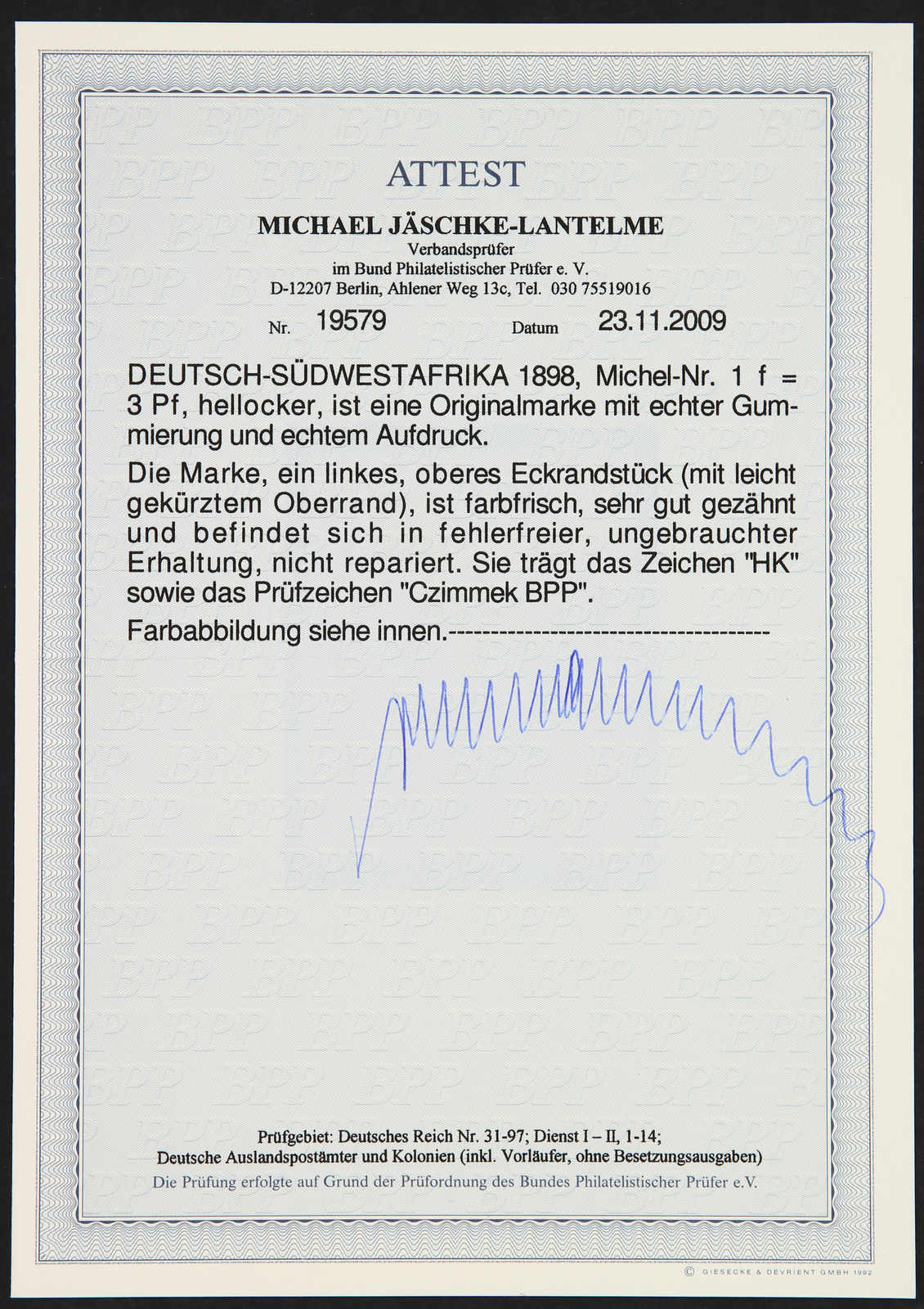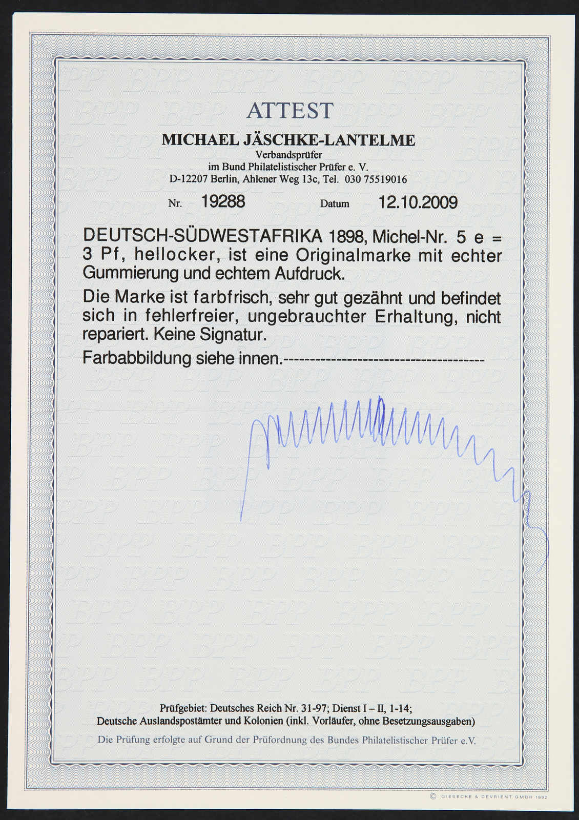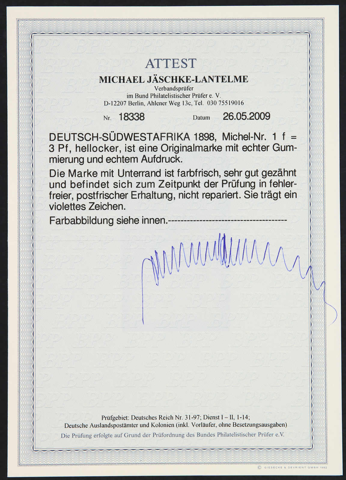 1898, 3 Pfg. Aufdruckausgabe hellocker, postfrisch, einwandfrei, unsigniert, Fotoattest Jäschke-Lantelme BPP (ME -,-) (Image) (imagea)
