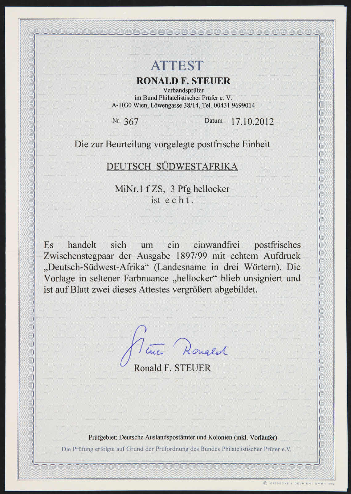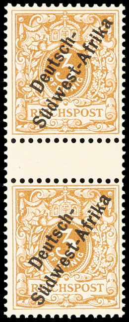 1897/99, 3 Pfg. Aufdruckausgabe hellocker, senkrechtes Zwischenstegpaar, postfrisch, einwandfrei, unsigniert, Fotoattest Steuer BPP (ME -,-, 1.500,- für *)