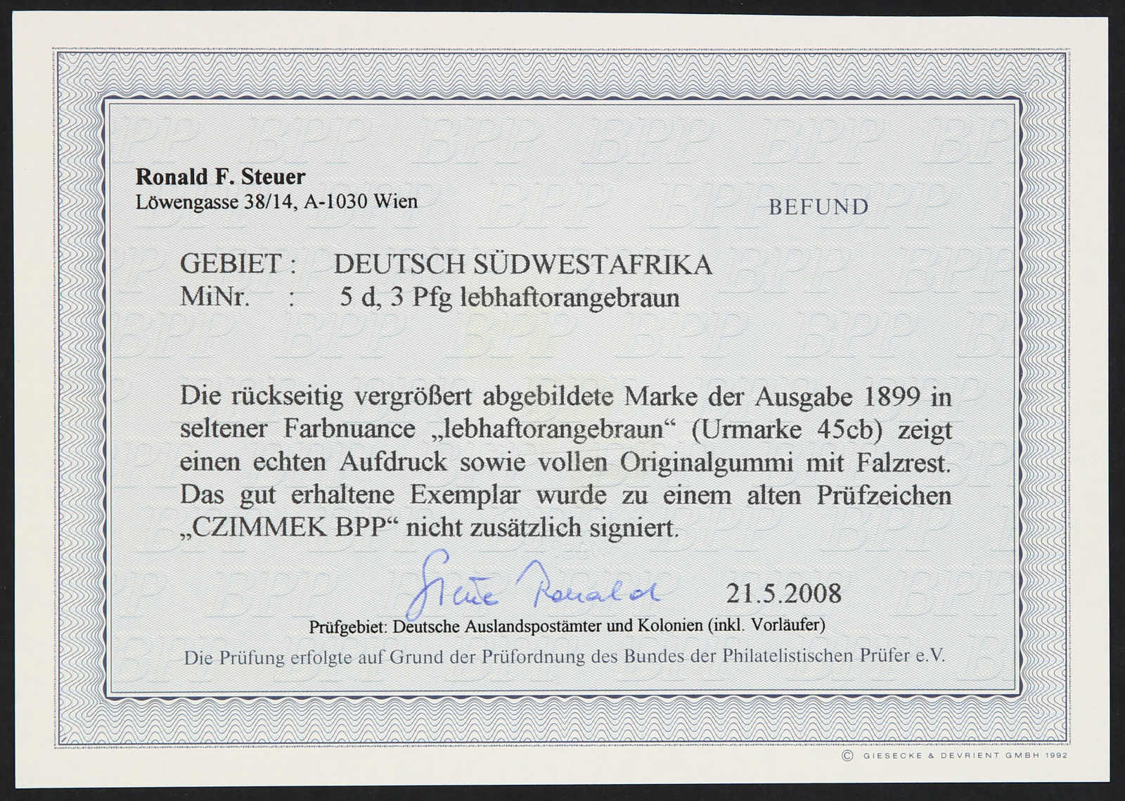 1899, 3 Pfg. Aufdruckausgabe lebhaftorangebraun, ungebraucht, einwandfrei, Fotoattest Steuer BPP (ME 1.000,-) (Image) (imagea)
