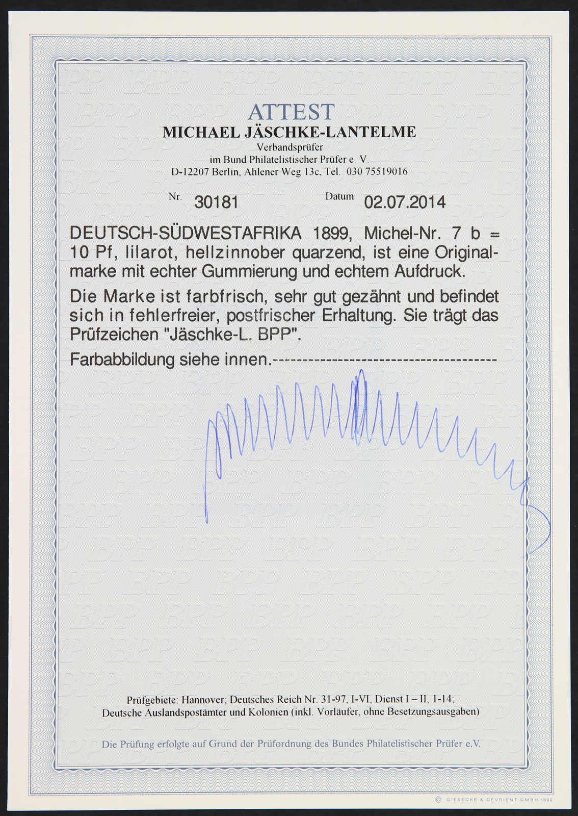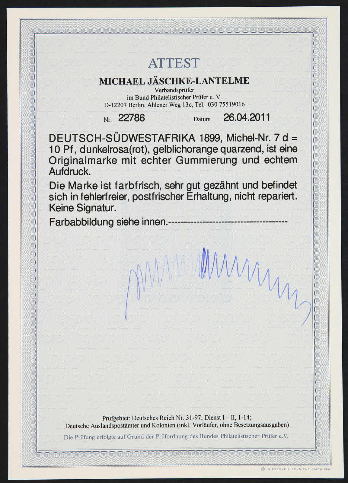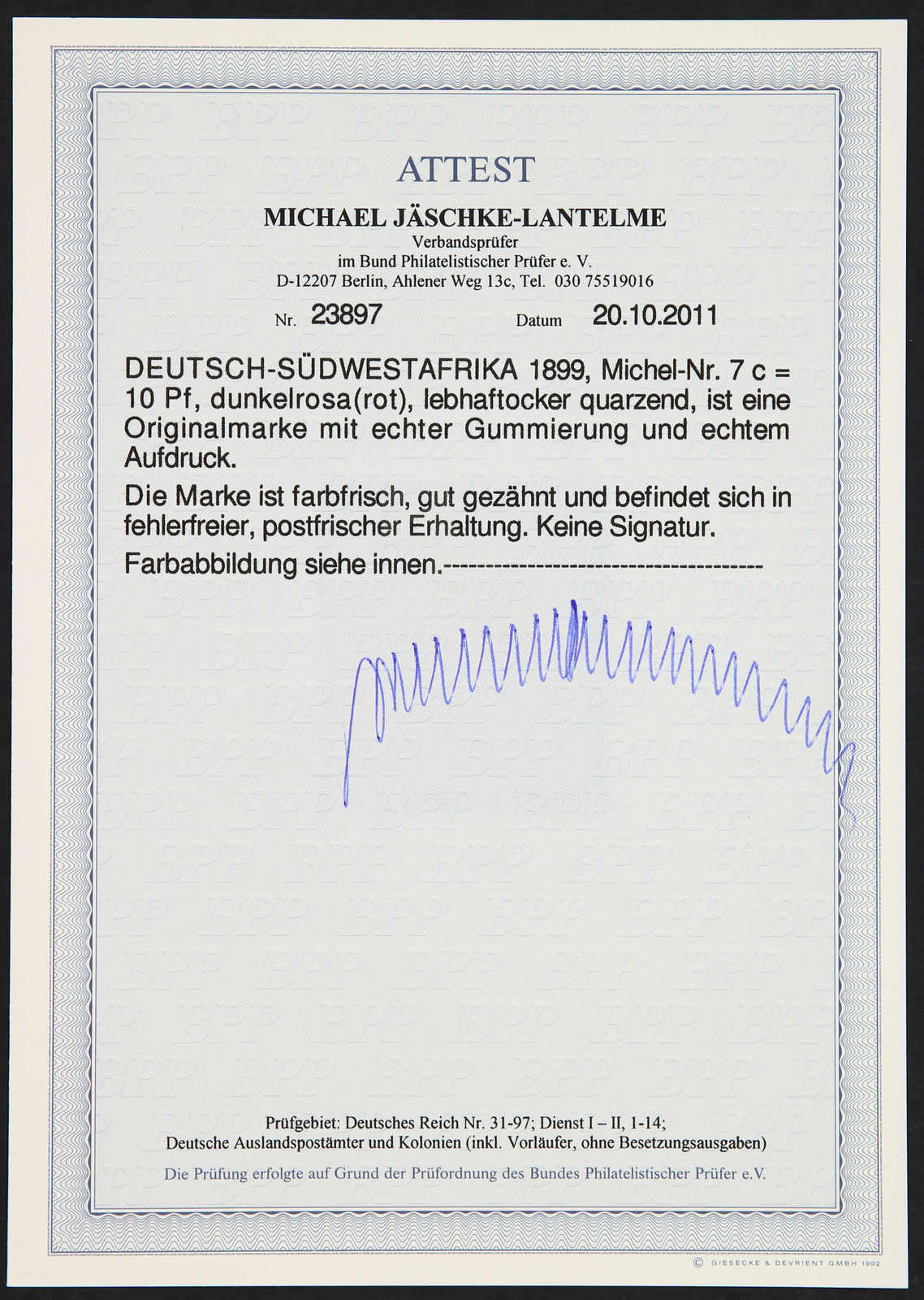 1899, 10 Pfg. Aufdruckausgabe dunkelrosa(rot), gelblichorange quarzend, postfrisch, einwandfrei, unsigniert, Fotoattest Jäschke-Lantelme BPP (ME 1.500,-)