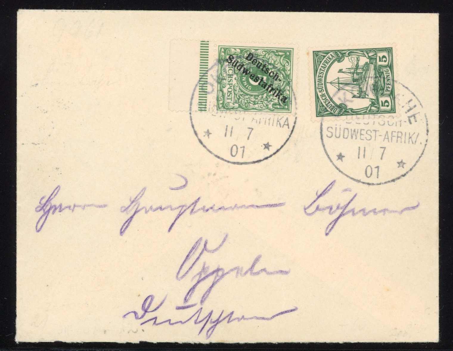 1901, 5 Pfg. Krone/Adler mit schrägem Aufdruck des Landesnamens in 2 Wörtern in Mischfr. mit 5 Pfg. Kaiseryacht, aufgegeben "OKOMBAHE DEUTSCH-SÜDWESTAFRIKA 11/7 01", portogerechte Frankatur auf Brief an Hauptmann Böhmer/Oppeln, seltene