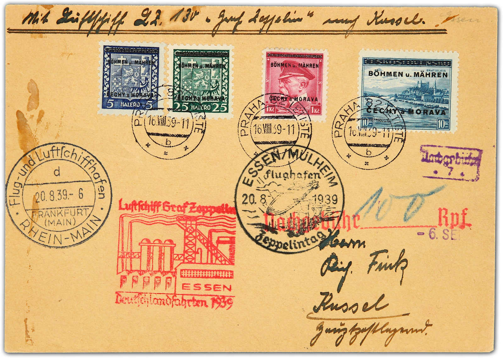 104 Brief MichelZeppelinundLuftp image1939, Essenfahrt, Zuleitungspost BÖHMEN & MÄHREN, seltener Brief mit Vollfrankatur Protektorat ab Prag 16.8.39 via Frankfurt 20.8. mit Bestätigungsstempel, adressiert nach Kassel, Stempel "Nachgebühr * 7 *", daher mit 100 Rpf. nachtaxiert (Image)