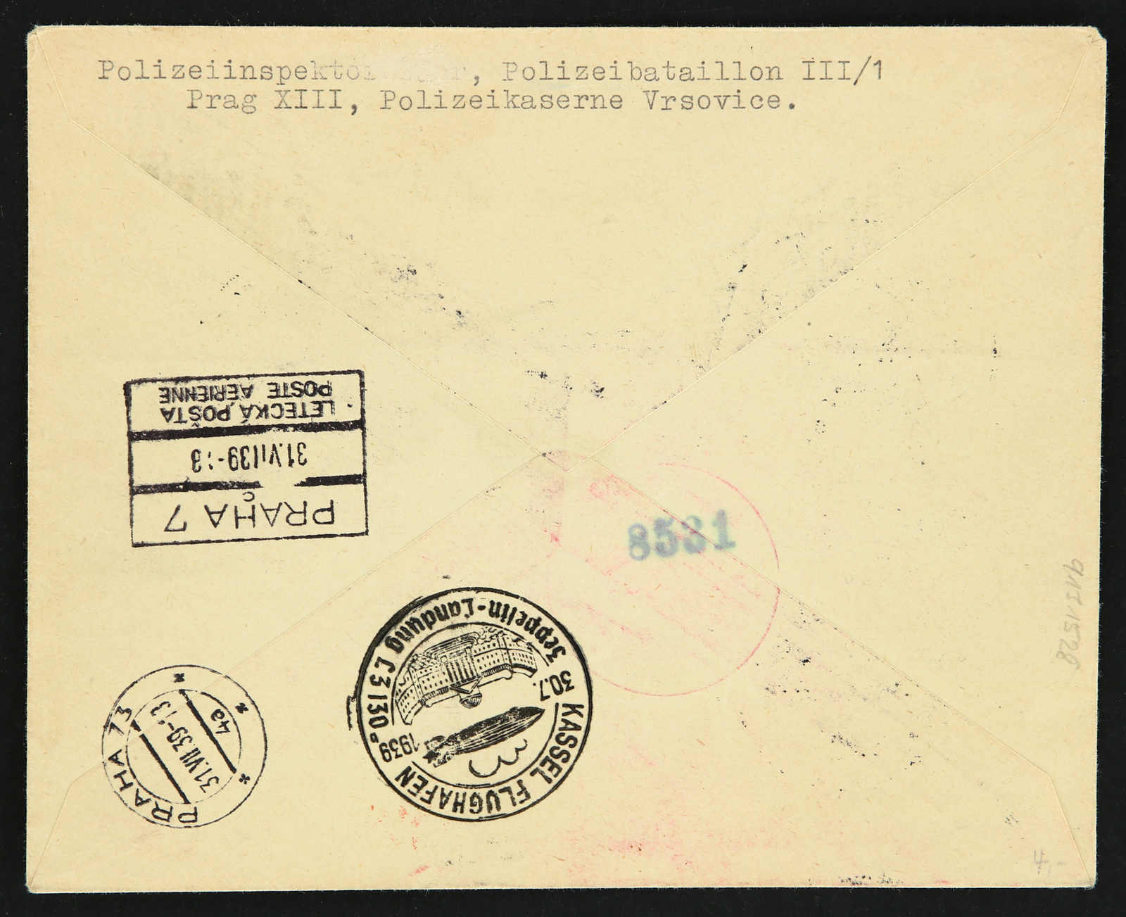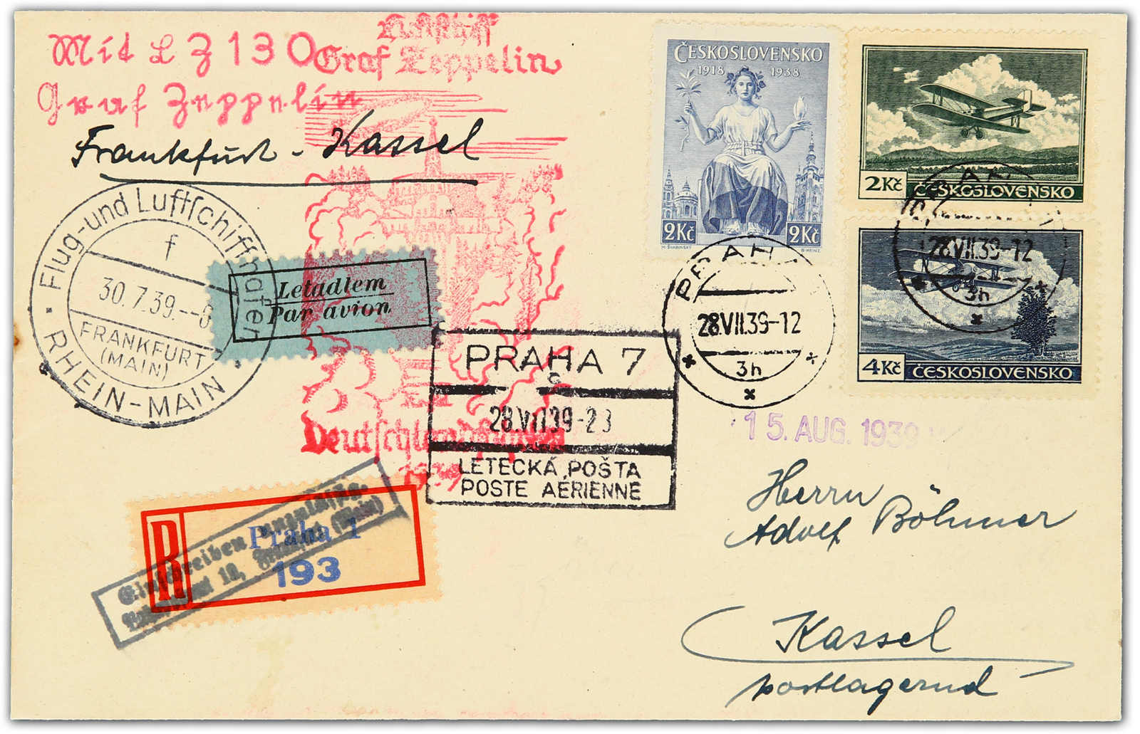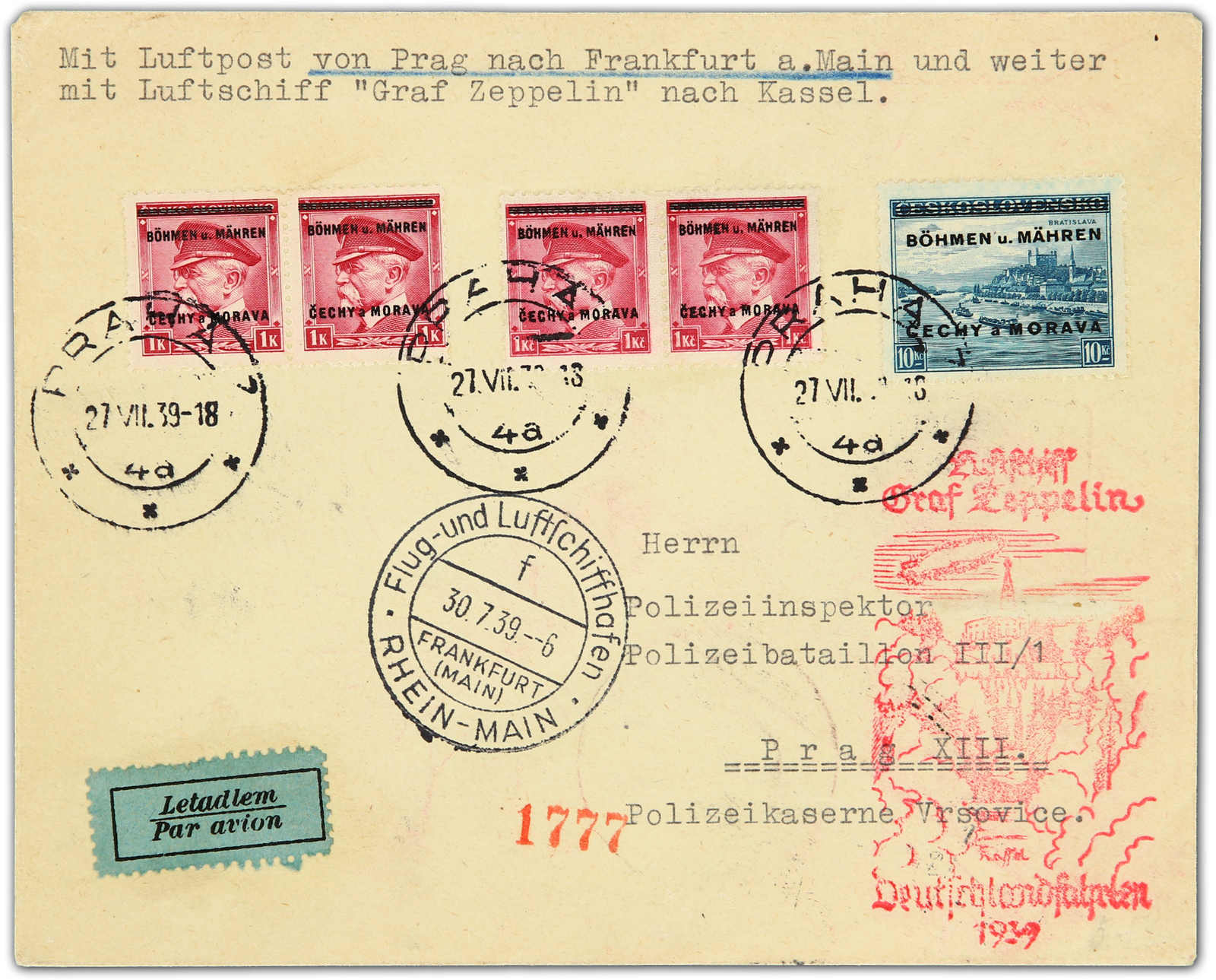 102 Brief MichelZeppelinundLuftp image1939, Kasselfahrt, Zuleitungspost BÖHMEN & MÄHREN, seltener Brief mit Vollfrankatur Protektorat ab Prag 27.7.39 via Frankfurt 30.7. mit beiden Bestätigungsstempeln, adressiert nach Prag 31.7. (Image) (imagea)