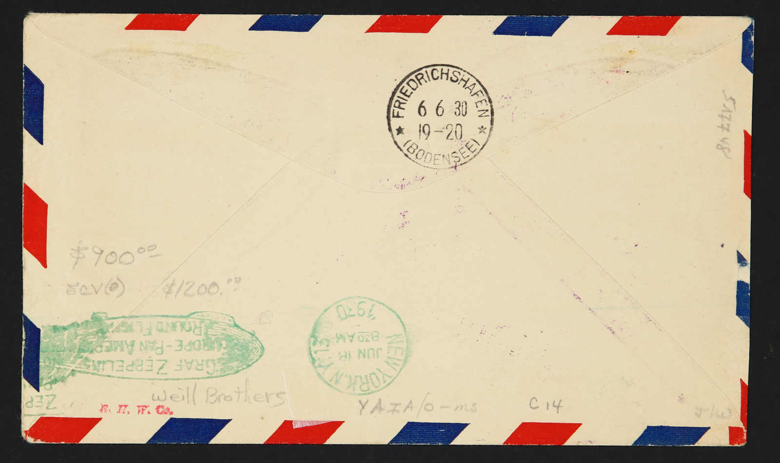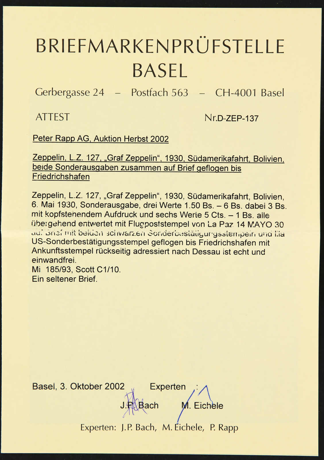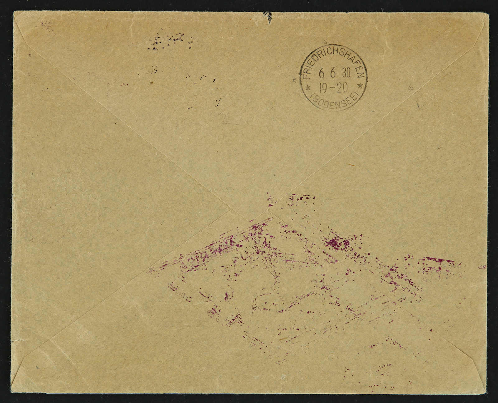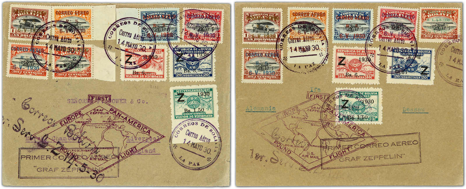 106 Brief MichelZeppelinundLuftp image1930, Südamerikafahrt, Bolivien-Post, Etappe La Paz - Rio de Janeiro - Recife - Friedrichshafen, 2 Satzbriefe zusammen mit der Zeppelinserie mit kopfstehendem Aufdruck von La Paz 14.5.30 mit bolivianischem und USA Bestätigungsstempel nach Friedrichshafen 6.6., adressiert nach Dessau resp. Liverpool, ein herrliches Ensemble (Image) (imagea) (imageb) (imagec)