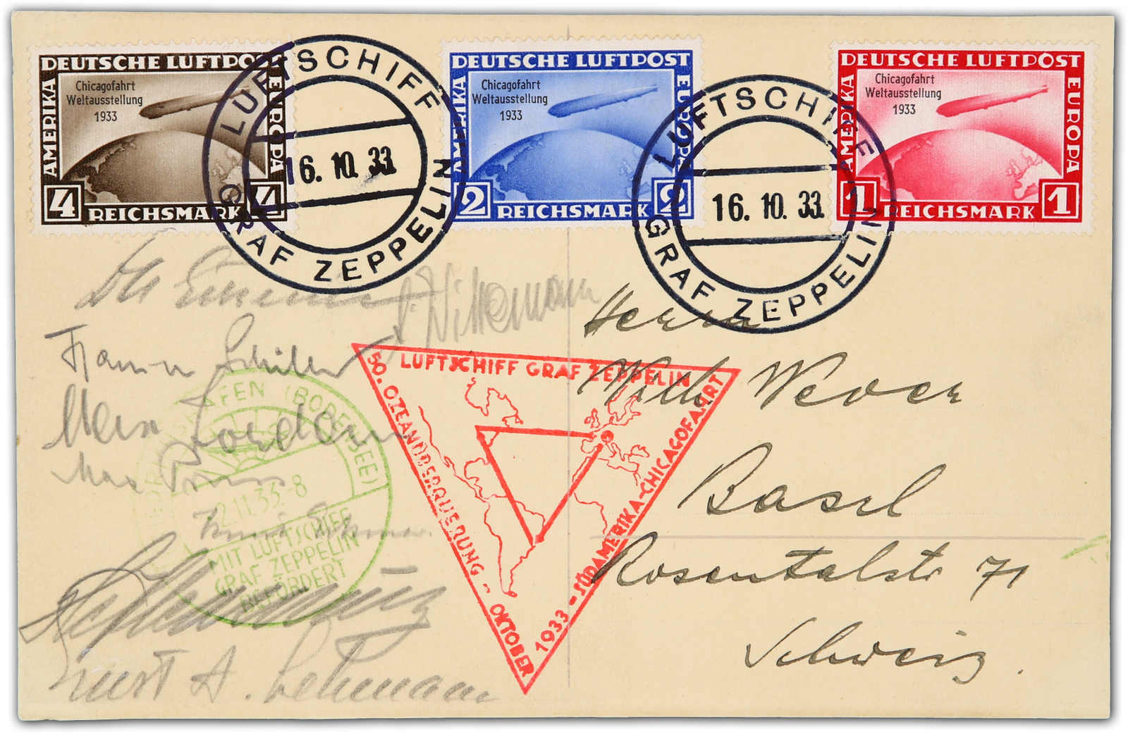 110 Brief MichelZeppelinundLuftp image1933, Chicagofahrt, Rundfahrt, Bordpostkarte frankiert mit Satz Chicagofahrt gestempelt mit Bordpoststempel vom 16.10.33 mit Unterschriften von 8 prominenten Besatzungsmitgliedern nach Friedrichshafen 2.11. adressiert nach Basel, ein Highlight für eine große Zeppelinsammlung in erstklassiger Qualität (Image)
