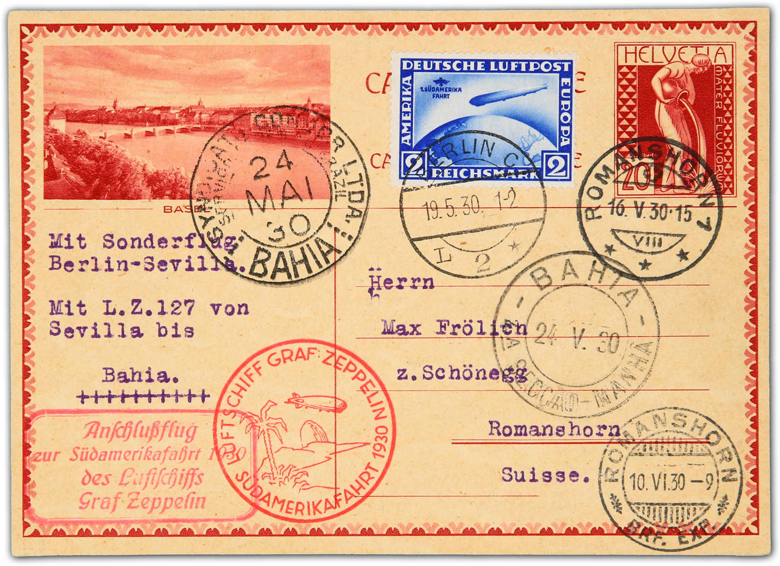 108 Brief MichelZeppelinundLuftp image1930, Südamerikafahrt, Berlin - Bahia, Zuleitungspost SCHWEIZ, 20 Rappen Bildpostkarte von Romanshorn 16.5. via Berlin mit 2 RM SAF-Marke entwertet am 19.5. mit Anschlussflug nach Friedrichshafen und weiter nach Bahia 24.5., adressiert nach Romanshorn 10.6. (Image)