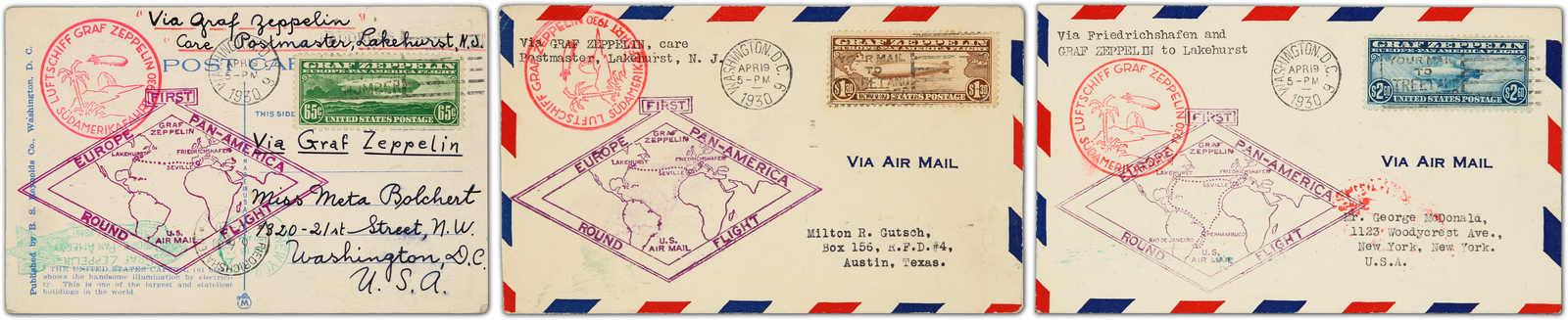 111 Brief image1930, Südamerikafahrt, USA Post, Serie 3 Werte Zeppelin-Sondermarken auf 3 FDCs ab Washington 19.4.30, 65 Cts. und 1,30 D. auf Rundfahrtbelegen, 2,60 D. auf der Etappe USA - Friedrichshafen - Lakehurst 31.5., herrliches Ensemble (Image) (imagea) (imageb) (imagec)