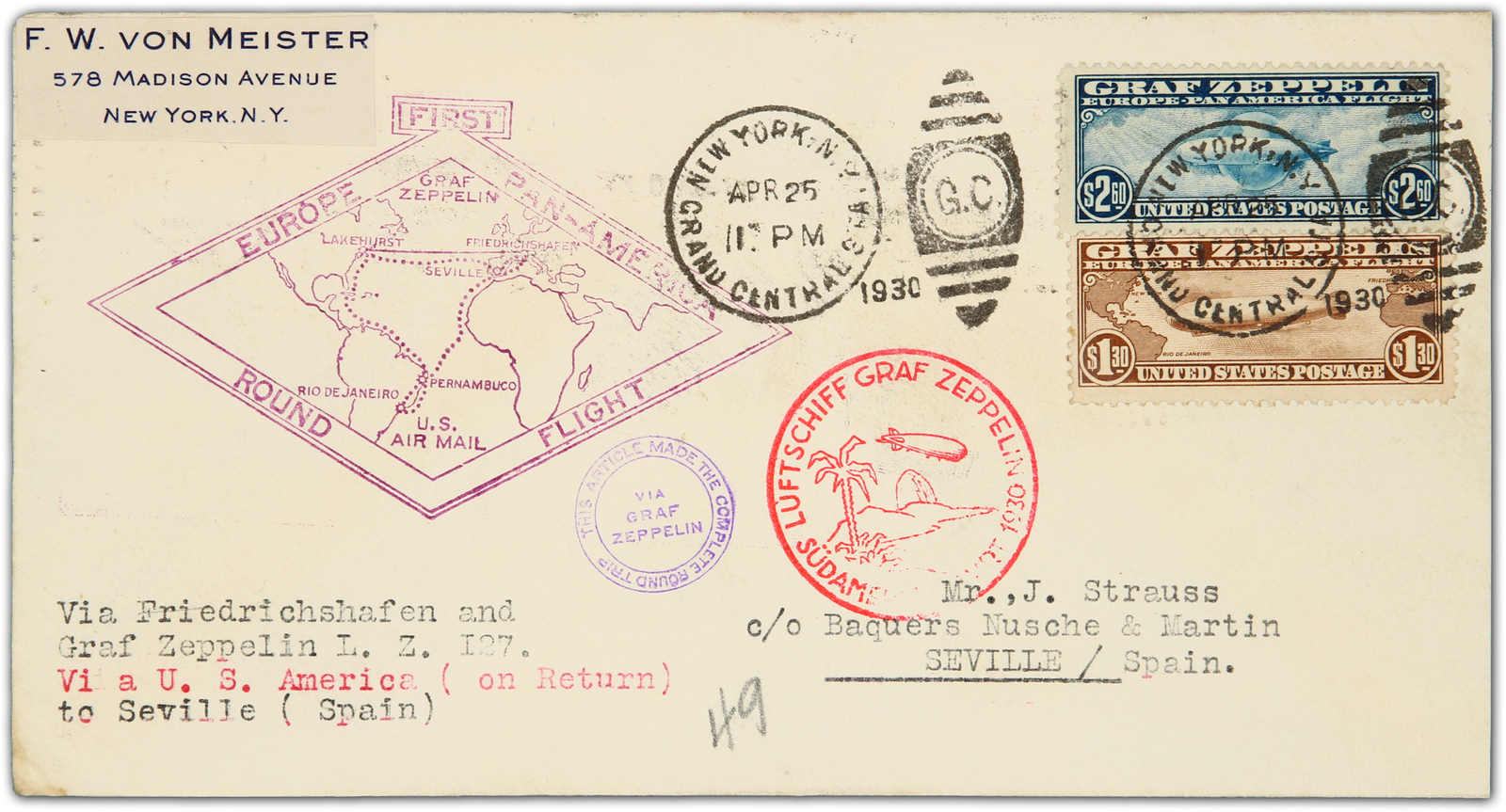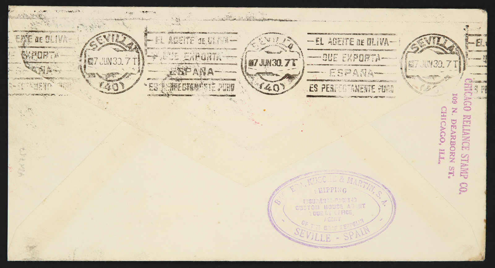 105 Brief MichelZeppelinundLuftp image1930, Südamerikafahrt, USA Post, Etappe Friedrichshafen - Rundfahrt - Abgabe Sevilla 2. Landung, Brief mit 1,30 und 2,60 D. Sondermarke von New York 25.4.30 nach Sevilla 7.6. mit allen 3 Bestätigungsstempeln (Image) (imagea)