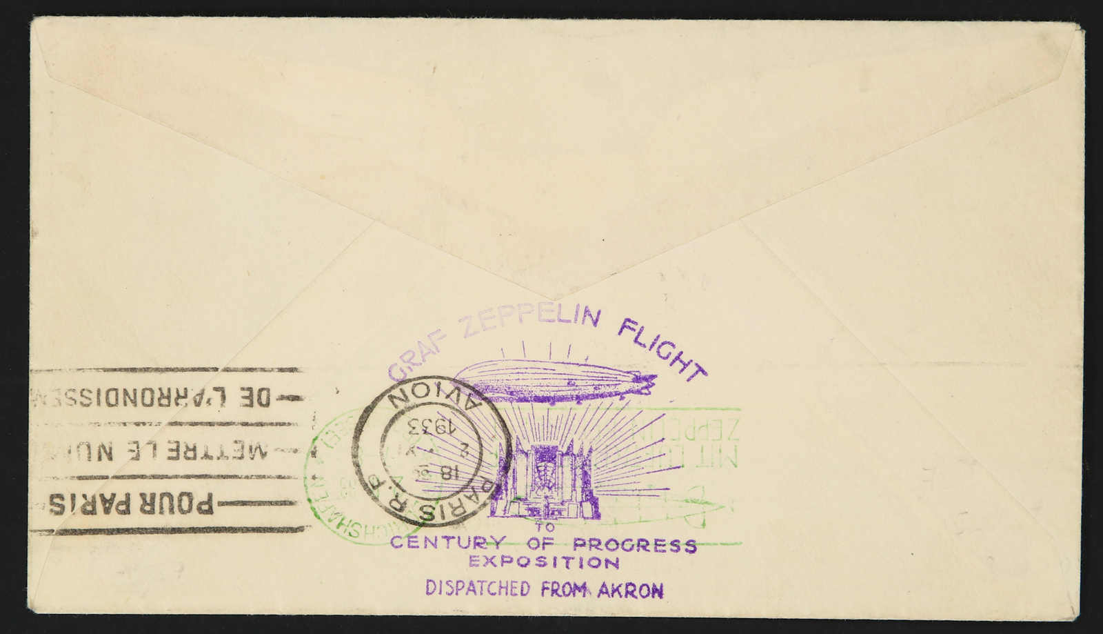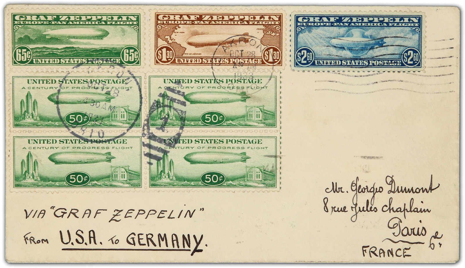 107 Brief MichelZeppelinundLuftp image1933, Chicagofahrt, USA Post, Etappe Akron - Friedrichshafen, Brief mit extrem rarer Frankaturkombination, Satz Mi-Nr. 326-328 von der Südamerikafahrt und Viererblock 358, sog. "Baby Zepp" von der Chicagofahrt ab Akron 28.10.33 nach Friedrichshafen 2.11., adressiert nach Paris 2.11., Verwendungen mit US Marken der Südamerikafahrt sind bislang unbekannt (Image) (imagea)