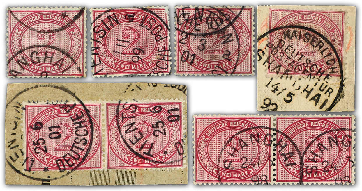 207 gest., Briefst. imageDEUTSCHE AUSLANDSPOST CHINA VORLÄUFER: 1892/1901, 2 M. Innendienst (Mi-Nr. V37 e, f) kl. Posten von zwei waagerechten Paaren und 4 Einzelwerten, alle bei der DP China verwendet, dabei Entwertungen von "TIENTSIN" und "SHANGHAI", teils mit verschiedenen Stempeln entwertet, dabei auch Plattenfehler der Urmarken, alle Werte sign. Zenker BPP oder Jäschke-Lantelme BPP, hoher Katalogwert, überwiegend gute Qualität (Image)