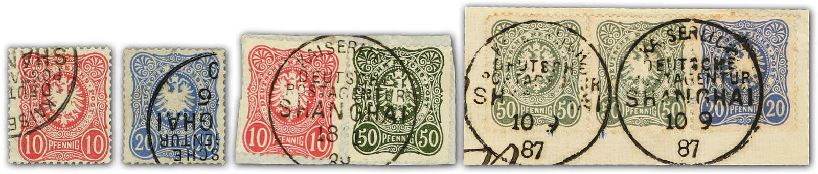 208 gest., Briefst. imageDEUTSCHE AUSLANDSPOST CHINA VORLÄUFER: 1887/89, kl. Posten der Votläufer-Ausgabe Pfennig, dabei Mi-Nr. V41 b lebhaftrotkarmin (2 Werte), V42 b mittelultramarin, sign. R. Steuer (im Michel nicht gelistet), V 42c dunkelultramarin, V 44a graugrün im waagerechten Paar und V44 d dunkelgraugrün, alle Werte gest. "KAISERLICH DEUTSCHE POSTAGENTUR SHANGHAI", farbfrisch und signiert, bei dem Paar der V44a einige Zahnspitzen getönt, sonst gute Qualität, hoher Katalogwert (Image)