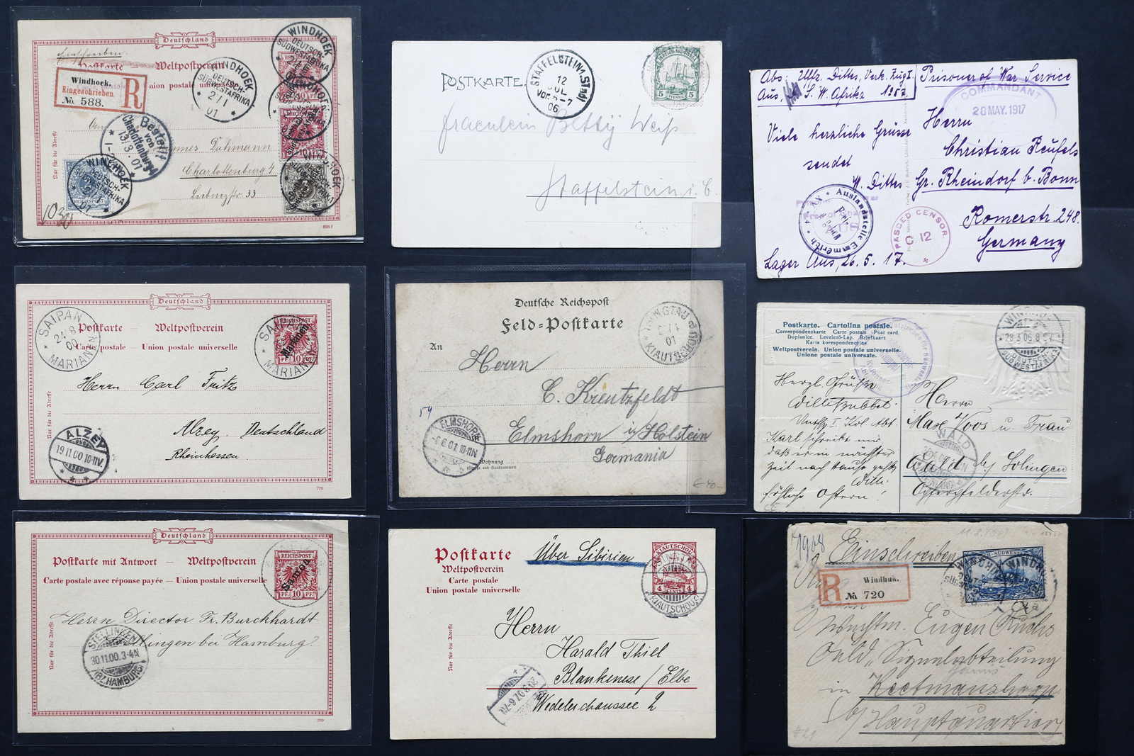 203 Brief imageDEUTSCHE KOLONIEN: 1894/1917, kleiner Posten Briefe und Ganzsachen, überwiegend gebraucht, dabei etwas Südsee mit Marianen und Samoa, Kiautschou mit Feldpost, Kamerun Seepost, Togo mit einigen Vorläufern und Deutsch-Südwestafrika mit Sammlerbrief, Ganzsachen mit Zusatzfrankatur als R-Karte befördert, frankierte Ansichtskarten und eine Karte eines Kriegsgefangenen aus 1917, ges. 21 Belege, hoher Katalogwert, überwiegend gute Qualität, dazu Posten an nachgedruckten Ansichtskarten (nicht gerechnet) (Image) (imagea) (imageb) (imagec) (imaged)