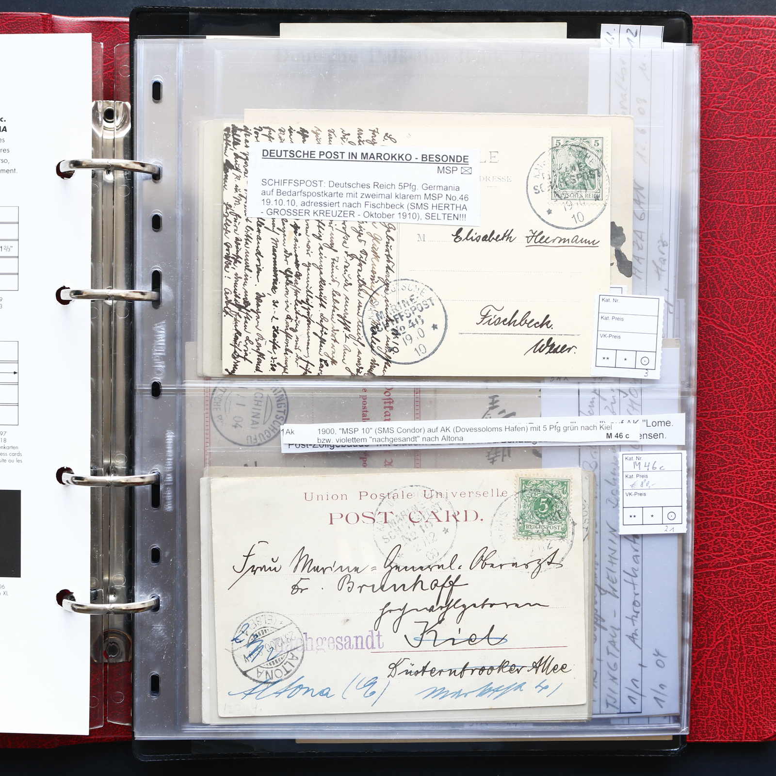206 Brief imageDEUTSCHE KOLONIEN & AUSLANDSPOSTÄMTER: 1884/1914, kleine Sammlung Briefe und Ganzsachen, dabei DP China mit seltenen Feldpoststempeln, meist auf Sammlerpost, DP Türkei und Marokko mit besseren Frankaturen, Deutsch-Ostafrika mit gebr. Privat-Ganzsachen, teils mit Zusatzfrankatur, Deutsch-Südwestafrika mit einer Bedarfskarte aus "Owikokorero" in violett auf Feldpost, etwas Samoa und einige Belege Marineschiffspost, dazu kl. Posten ungebrauchte Ganzsachen, gesamt knapp 50 Belege im Briefealbum, hoher Katalogwert, überwiegend gute Qualität (Image) (imagea) (imageb) (imagec) (imaged) (imagee) (imagef) (imageg) (imageh) (imagei) (imagej) (imagek) (imagel) (imagem) (imagen) (imageo) (imagep) (imageq) (imager) (images) (imaget) (imageu) (imagev) (imagew) (imagex)