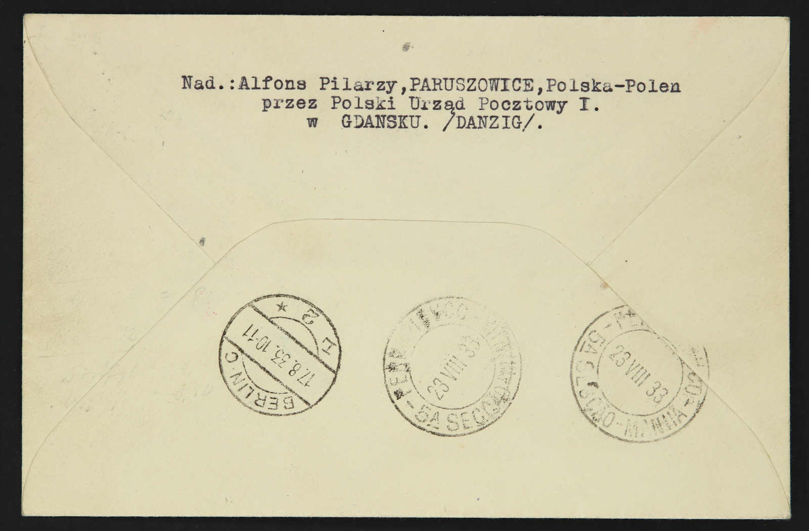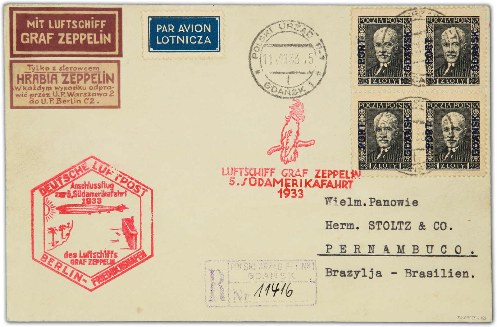 109 Brief MichelZeppelinundLuftp image1933, 5. Südamerikafahrt, Zuleitungspost DANZIG (POLNISCHE POST), R-Brief ab Gdansk 11.8.32 via Berlin 17.8. mit Anschlussflug nach Friedrichshafen und weiter nach Pernambuco 23.8., nur 18 Belege ab Port Gdansk bekannt, sign. Korszen (Image) (imagea)