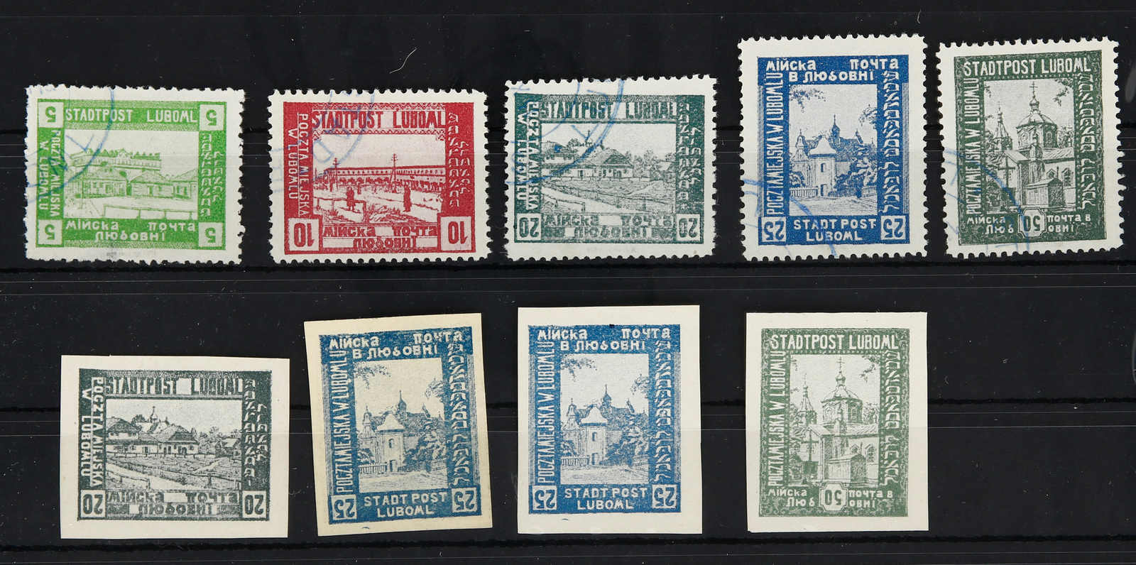 2059 og, cto imagePOLEN LOKALAUSG. LUBOML: 1918, 5 H. bis 50 H. Stadtansichen, kl. Posten der Werte mit kopfstehender Wertangabe, dabei I bis V gez. mit Gefälligkeitsentwertung und die Werte zu 20, 25 und 50 H. geschnitten, ungebraucht, teils mit leichten Haftspuren, alle Werte sign. Petriuk, hoher Katalogwert (Image)