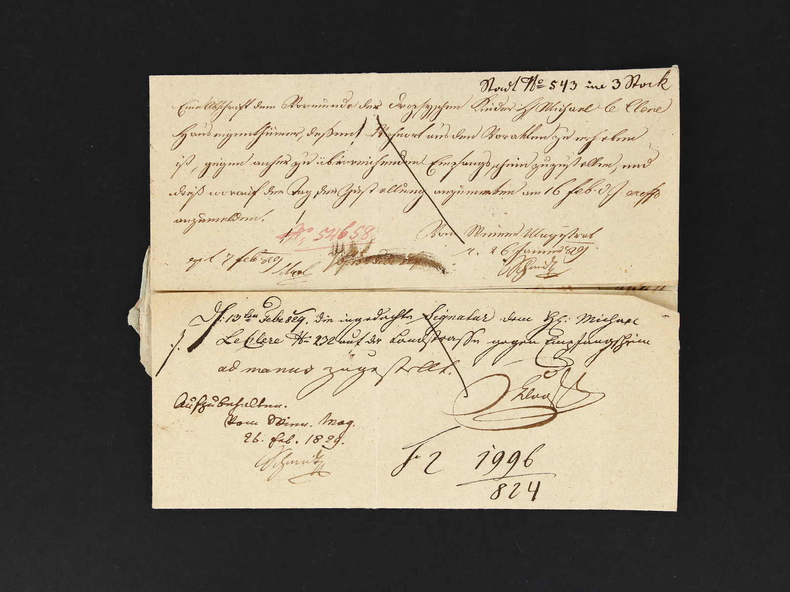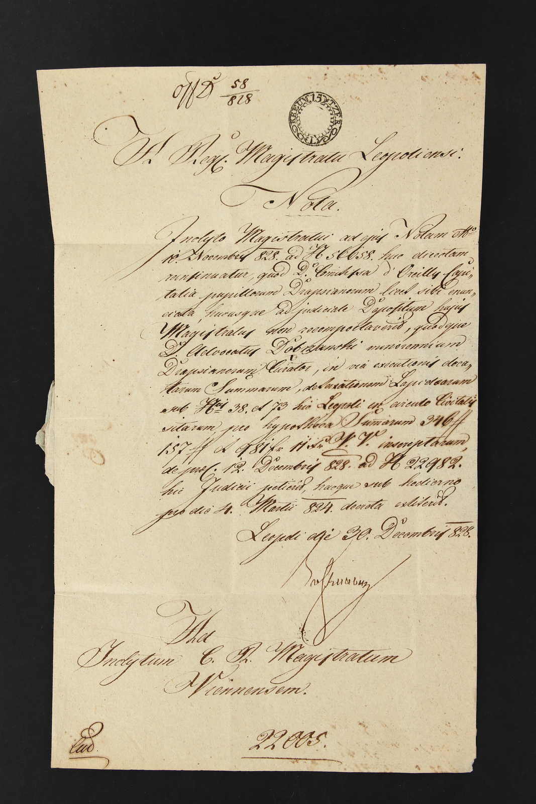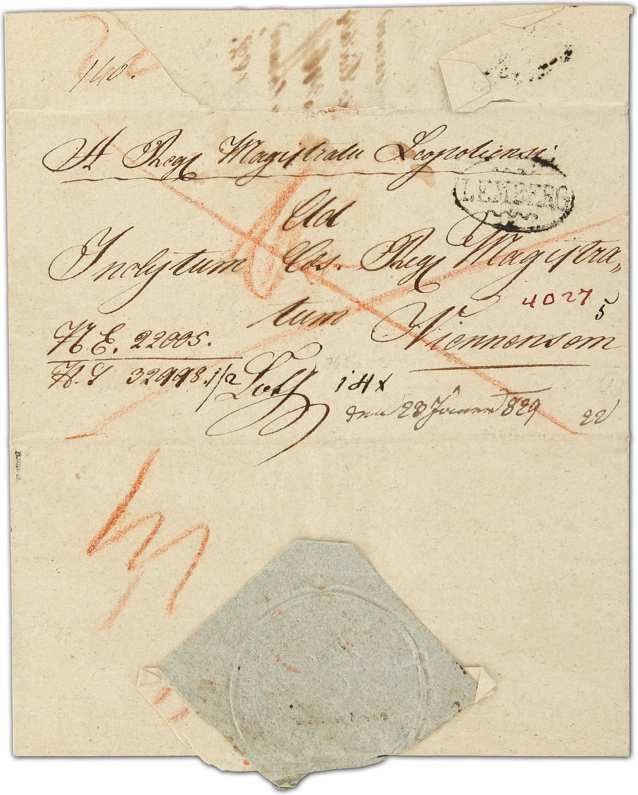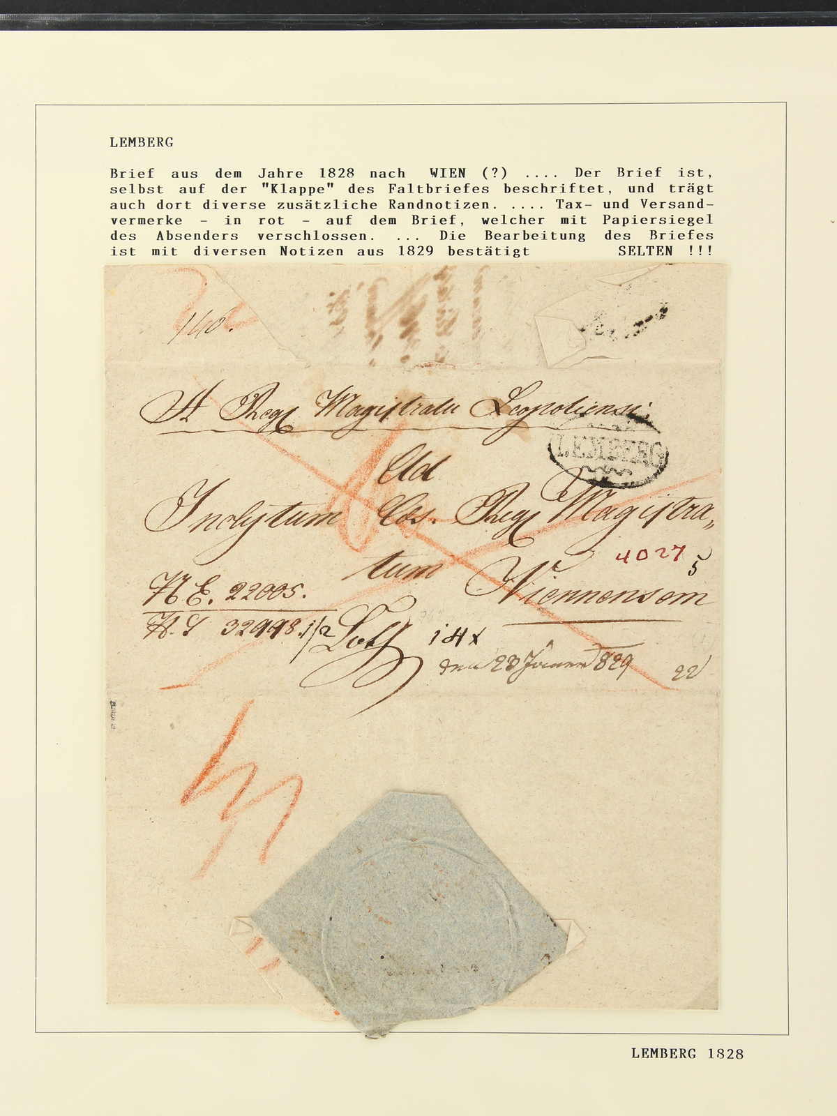2073 Brief image1828, Faltbrief mit kpl. Inhalt und ovalem Zierstempel "LEMBERG" ohne weitere Angaben als Aufgabestp. auf der Vorderseite, adressiert nach Wien, mit Rötelvermerk "6" und einem roten Kreuz, verschlossen mit Papiersiegel des Absenders, gute Qualität, ein früher Beleg (Image) (imagea) (imageb) (imagec)