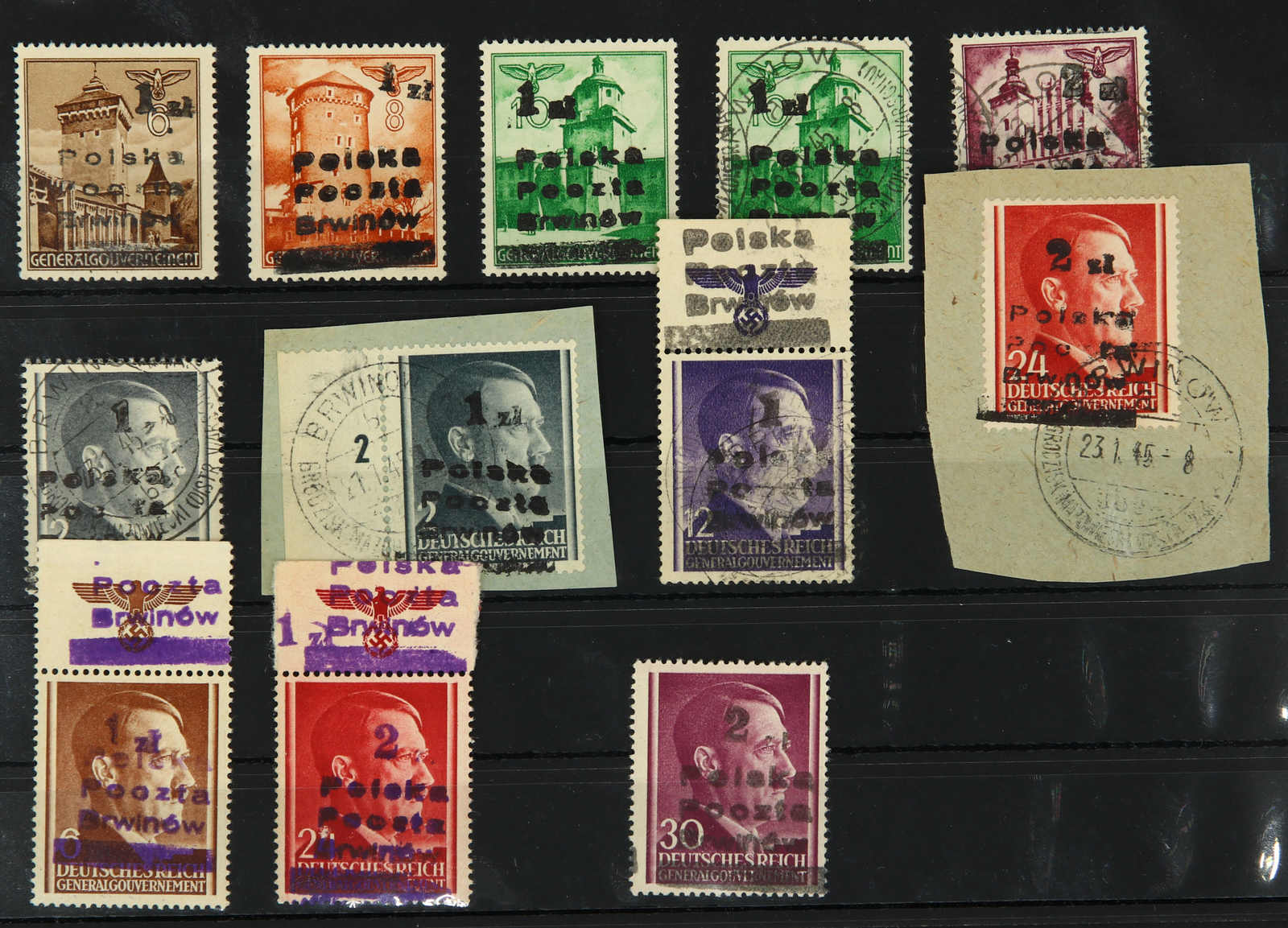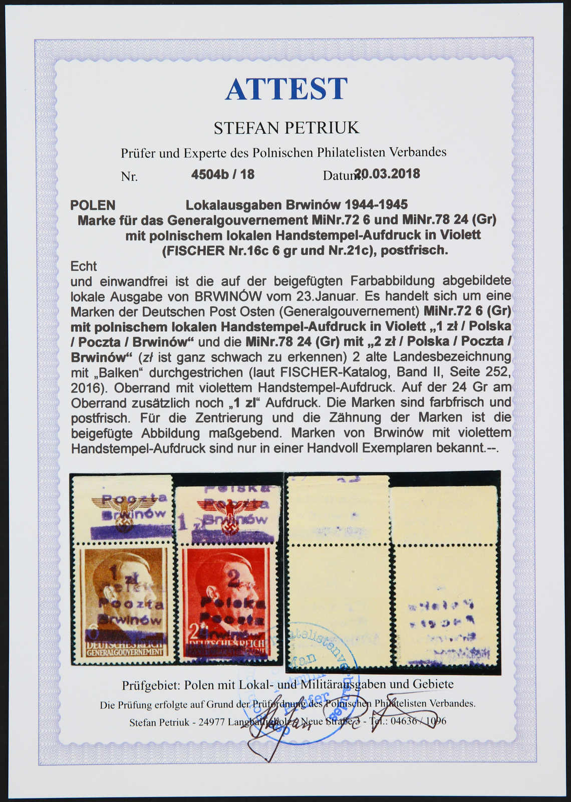 2063 nh, og, gest., Briefst. imagePOLEN LOKALAUSGABE II. WK BRWINOW: 1945, gemischte Zusammenstellung **/*/o, dabei nach Fischer Nr. 1, 2, 3 (2x), 14 (2x), 15 c in Violett mit Oberrand-Aufdruck, 18, 21 beide in Schwarz und 21 c in Violett mit Oberrand-Aufdruck (von dieser Marke sind bisher nur eine Handvoll Exemplare bekannt) sowie 22, alle Werte sind sign., u.a. M. Perzynski oder T. Gryzewski, überwiegend gute Qualität, im Michel ohne Preisangabe, selten angeboten, für die Nr. 15 c und 21 c Fotoattest Petriuk PZF (Image) (imagea)