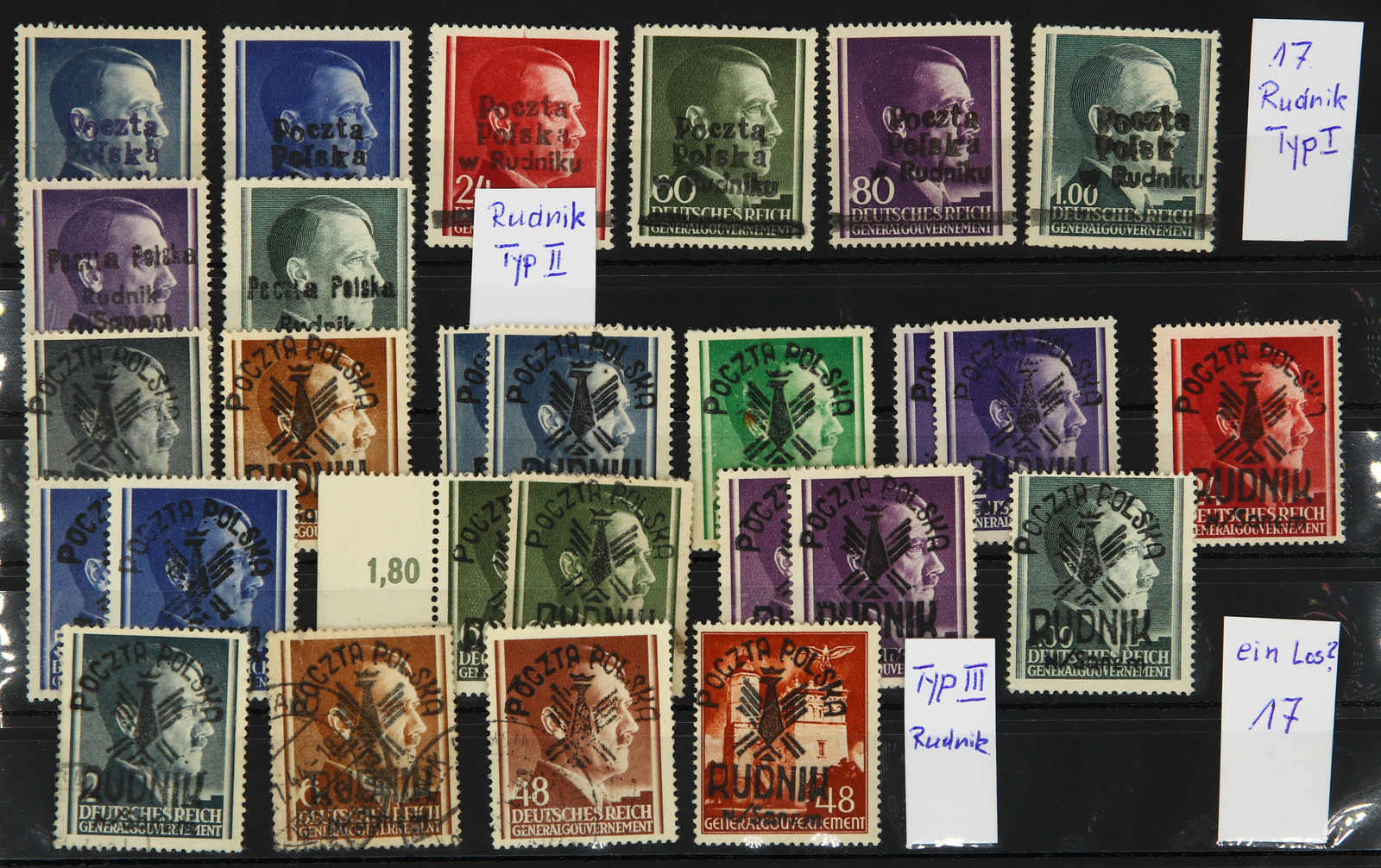 2064 nh, og, gest. Michel:I,III,IV imagePOLEN LOKALAUSGABE II. WK RUDNIK: 1944, kleine Sammlung von Fischer Nr. 2 6 Gr bis 1,00 Zl., Marken des Generalgouvernements mit drei verschiedenen Aufdruck-Typen (Typ I, II, III), die 60 Gr mit Doppeldruck Typ II, 28 Werte überwiegend postfrisch, ungebraucht und gestempelt, alle Werte einwandfrei, farbfrisch und gut gezähnt, sign. J. Ryblewski, Jungjohann BPP, Petriuk BPP, Im Michel nicht bewertet und nach Fischer hoher Katalogwert. (Image)