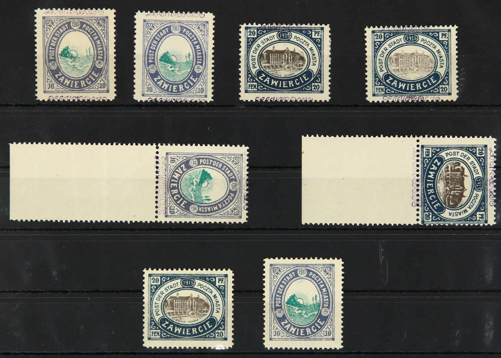 2062 og imagePOLEN STADTPOST ZAWIERCIE I. WK: 1916, Mi-Nr.1 II / 2 II (6 Stück) sowie Nr. 1 III / 2 III (2 Stück) ungebraucht, ME über 1.000,-, signiert Landré BPP oder Petriuk PZF (Image)
