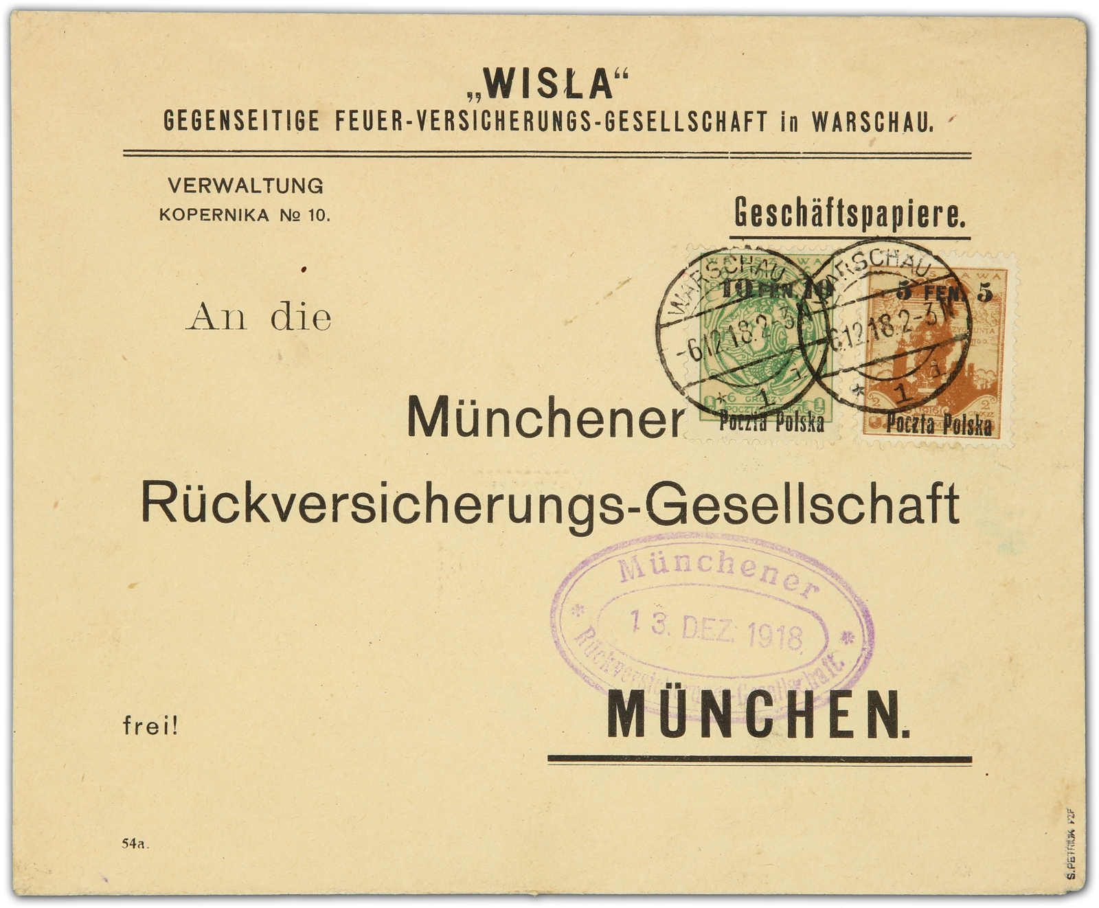 2075 Brief Michel:2,3 image1918, 5 und 10 Fen. Aufdruckmarke auf Brief nach München, weiterverwendeter deutscher Stempel "WARSCHAU 6.12.18", sign. Petriuk (Image)