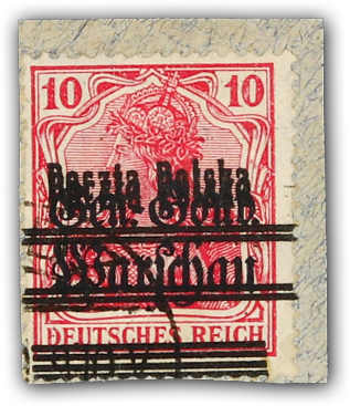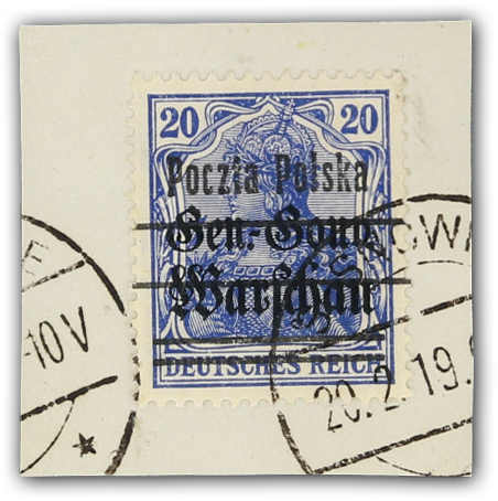 1919, 20 Pfg. Germania, Freimarke der Deutschen Post in Polen (grau)ultramarin mit schwarzem Aufdruck "Poczta Polska" und dem alten Aufdruck zweifach durchbalkt, gest. Einzelwert auf Briefstück, entwertet mit weiterverwendetem deutschen