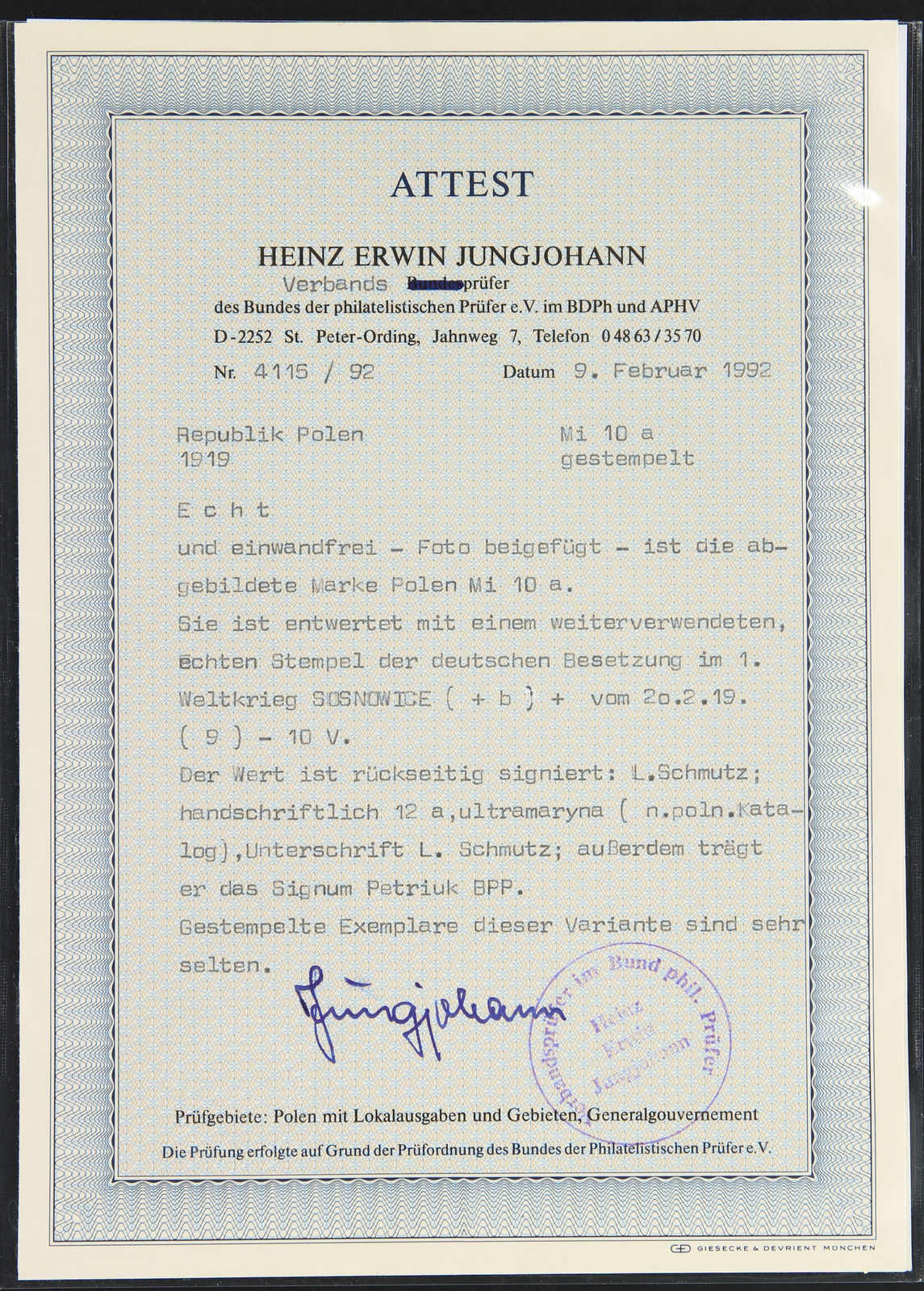 Stempel "SOSNOWICE (+b) 20.2.19", farbfrisch und gut gezähnt, einwandfrei, gest. selten angeboten, sign. L. Schmutz und hsl. Farbbestimmung "ultramarin", sign. Petriuk BPP und Fotoattest Jungjohann (ME 3.500,-) (Image) (imagea)