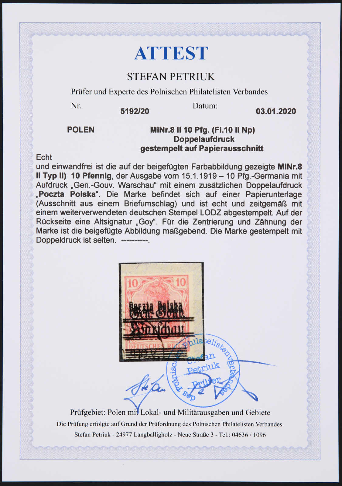 1919, 10 Pfg. Germania-Marke der Ausgabe für das Generalgouvernement Warschau mit Doppelaufdruck Poczta Polska (Fischer 10 II Np), gestempelt auf Papierunterlage, Fotoattest Petriuk (Fischer 2.000 Zl.) (Image) (imagea)