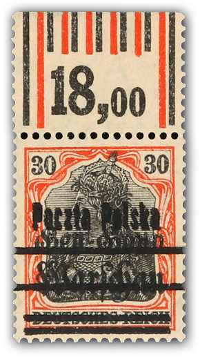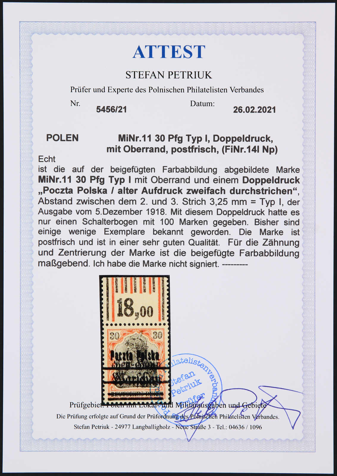 1919, 30 Pfg. mit Oberrand, Germania-Marke der Ausgabe für das Generalgouvernement Warschau mit Doppelaufdruck Poczta Polska, postfrisch, unsigniert, Fotoattest Petriuk (Fischer 14 I Np, 5.000 Zl.) (Image) (imagea)