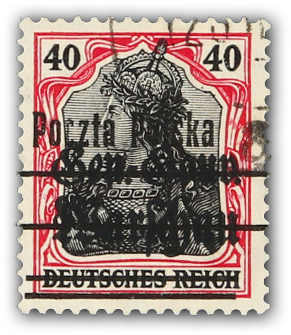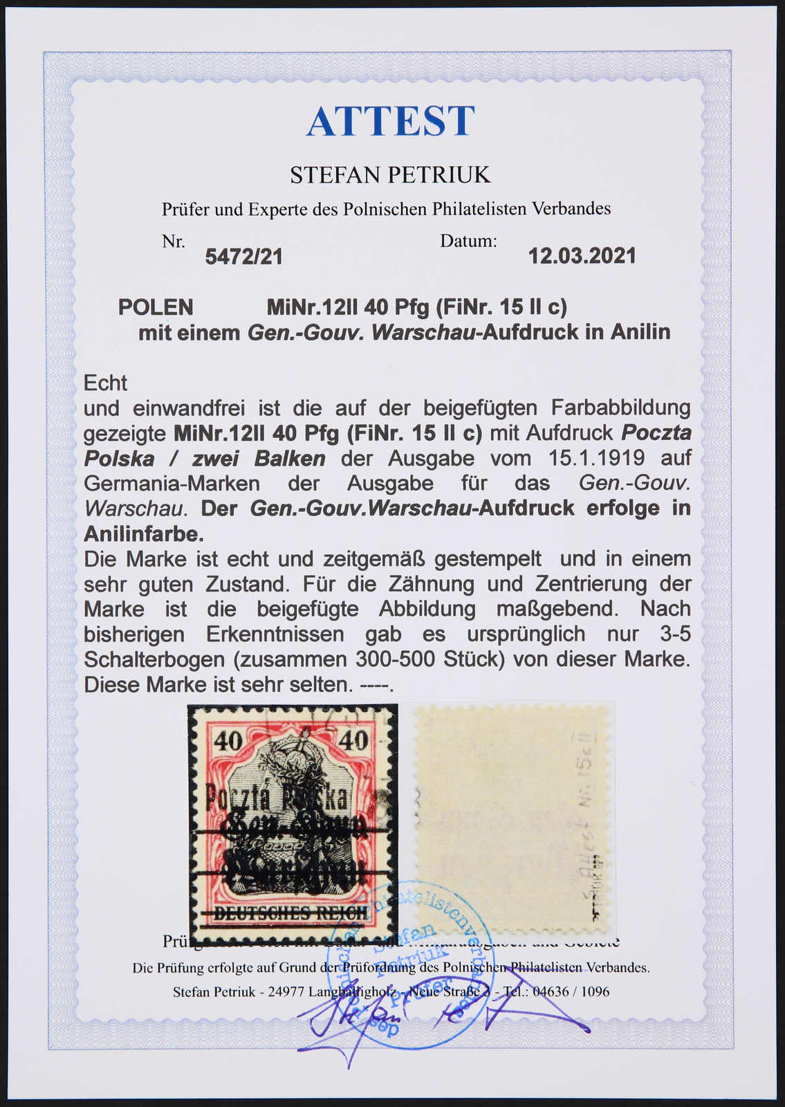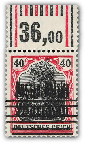 1919, 40 Pfg mit einem Generalgouvernement-Warschau-Aufdruck in Anilinfarbe, zeitgemäß gestempelt und in einem sehr guten Zustand, nach bisherigen Erkenntnissen gab es ursprünglich nur 3 bis 5 Schalterbogen von dieser Marke (zusammen