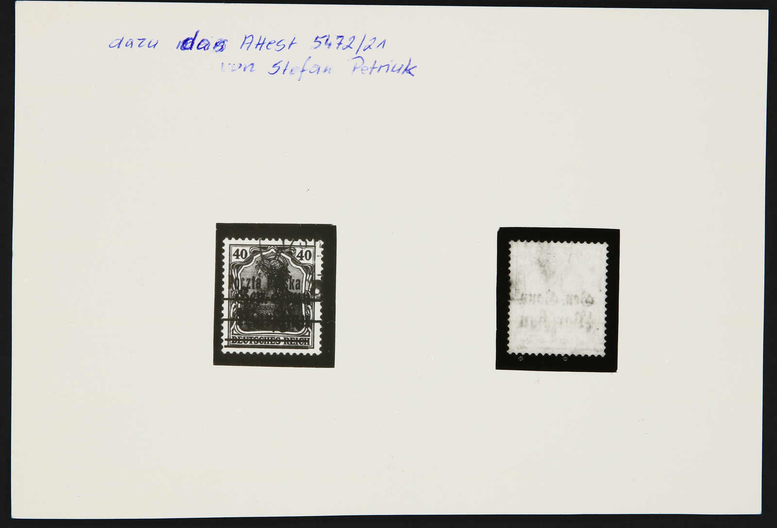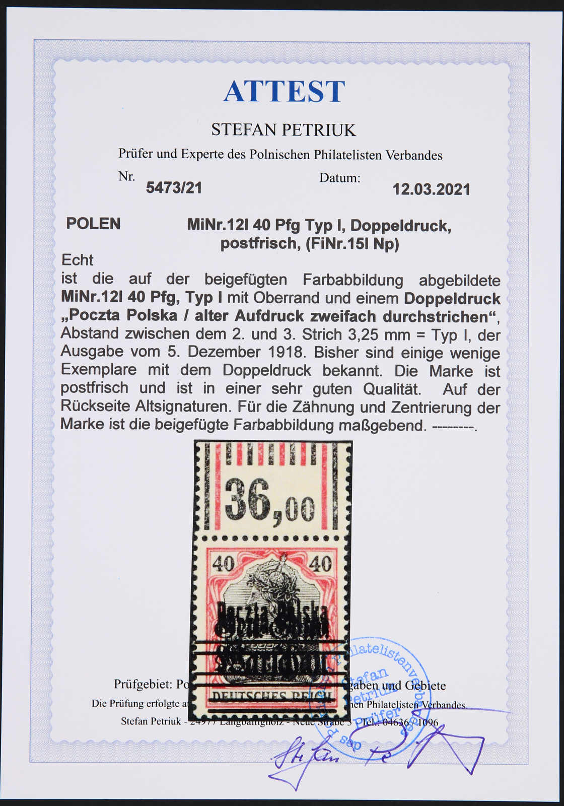 1919, 40 Pfg. mit Oberrand, Germania-Marke der Ausgabe für das Generalgouvernement Warschau mit Doppelaufdruck Poczta Polska, postfrisch, sign. Schmutz, Fotoattest Petriuk (FiNr.15 I Np, 2.000 Zl.) (Image) (imagea)