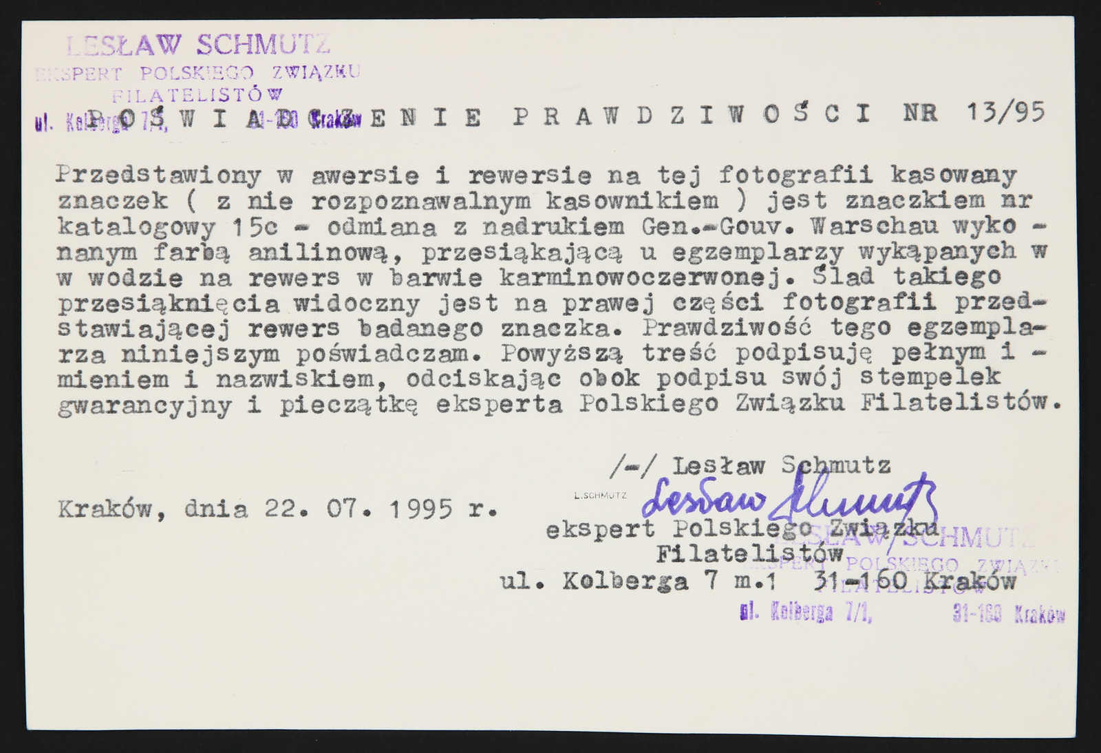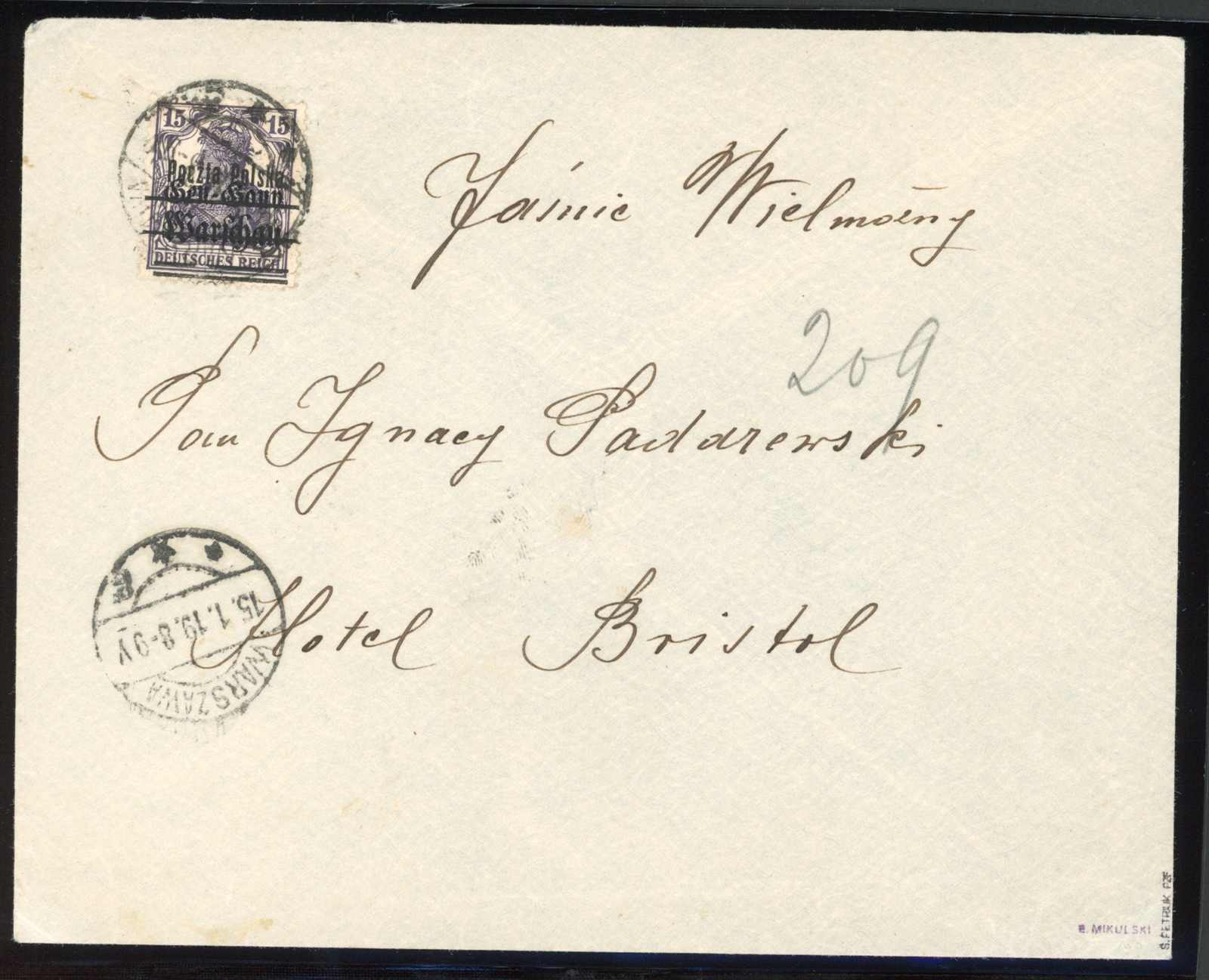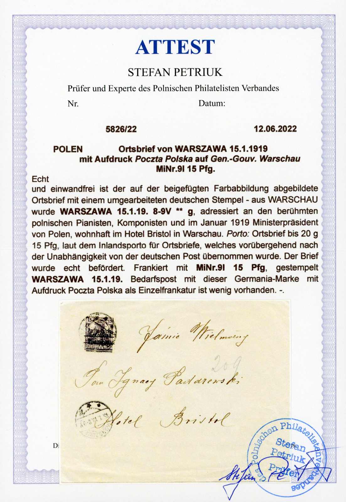 1919, 15 Pfg. Aufdruck Poczta Polska auf Gen.-Gouv. Warschau auf Ortsbrief an Ignacy Paderewski, den berühmten polnischen Pianisten und Komponisten, im Januar 1919 Ministerpräsident von Polen, sign. und Fotoattest Petriuk 06/2022 (Image) (imagea)