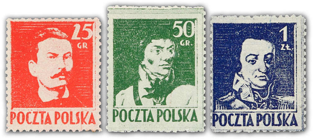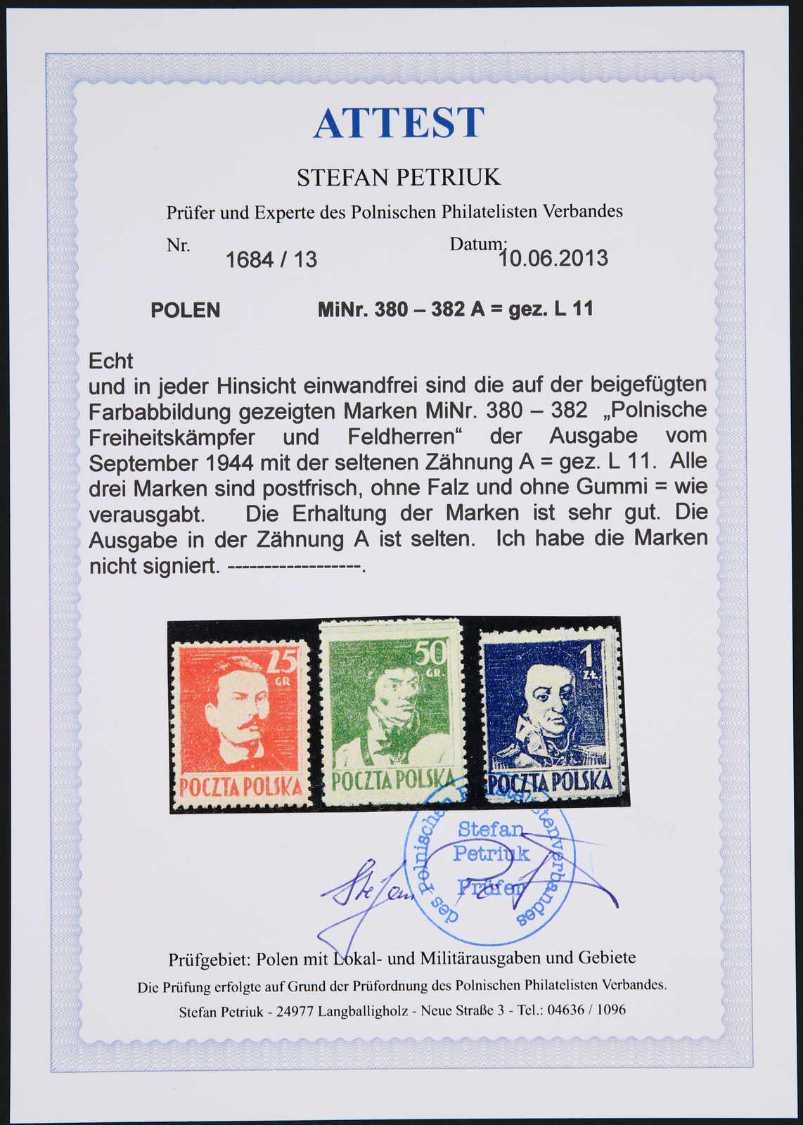 1944, 25 Gr. bis 1 Zl. polnische Freiheitskämpfer und Feldherren, gez. L 11, alle drei Marken sind postfrisch, sehr gute Qualität, die Zähnung A ist selten, Fotoattest Petriuk (Image) (imagea)