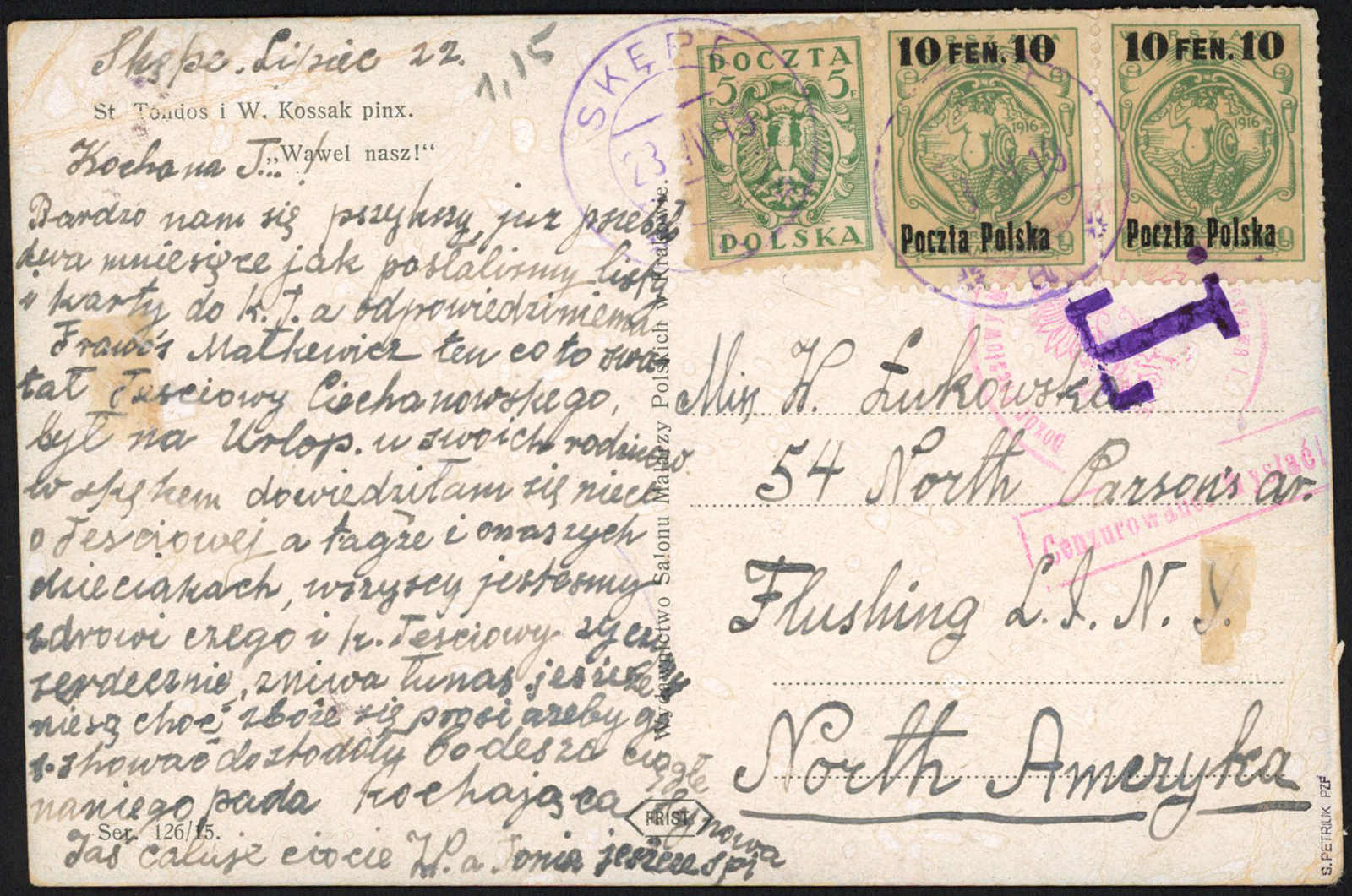 1919, 10 Fen. Aufdruckmarke 2mal mit 5 F. polnischer Adler auf Ansichtskarte mit seltenem Ortsstempel "SKEPE 23.VII.19" in Violett nach Flushing/USA, polnische Militärzensur und Nachportovermerk "T" von Warschau wegen Ungültigkeit der 10